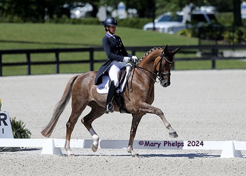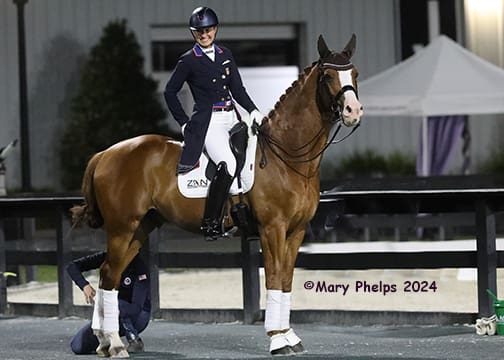 Ocala, FL – With new mount Helix, owned by Zen Elite Equestrian Center and Heidi Humphries, U.S. Olympic team silver medalist Adrienne Lyle scored a hat trick of victories at the World Equestrian Center (WEC) April Dressage CDI3* sponsored by Hampton Green Farm and Discover Dressage on Saturday, April 13, 2024. They won the Grand Prix Special CDI3* for Lyle’s third win in three days. Fédération Equestre International (FEI) and USEF/USDF-rated classes at the show conclude on Sunday, April 14.