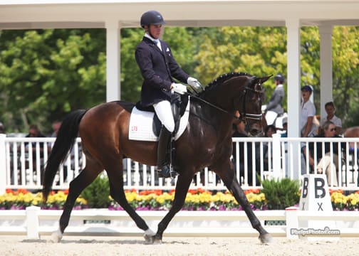 Alice Tarjan and Elfenfeuer (Florencio I-Elfensonne by Sion) the first combination to perform their Preliminary Test for the five-year-old division set the standard no one else in the 14 horse field could rival. The Oldenburg mare owned by Tarjan (Oldwick, NJ) scored an overall 7.66 after earning high marks for submission, 8.0, and 7.8 for their canter and general impression. They also scored 7.7 and 7.0 for their trot and walk respectively in the Preliminary Test, which counts for 40% of the overall Championship score. Tarjan and Elfenfeuer were the winners of the East Coast Young Horse Trials held in May, at Morven Park, Virginia. Elfenfeuer is competing in her first Markel/USEF National Young Horse Dressage Championship after having bypassed the annual event as a four-year-old. Heading into Saturday’s Final Test, Tarjan is hoping the mare will be more settled in her second Championship test. “She was really tight and on the muscle (today), it was not our best test. (Saturday) I hope she is a little more relaxed and we can have fun.”