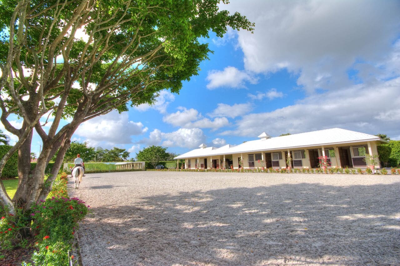 Fully appointed, turn-key dressage facility in the heart of Wellington on the bridle path in Paddock Park. Barn boasts 8 stalls, 12×14 with zoning for a total of 10 stalls. The regulation dressage arena has great footing and top line mirrors. Your horses will enjoy grass paddocks and privacy hedges surrounding the property. A separate gated entrance to the barn makes deliveries and visitors private and easy.