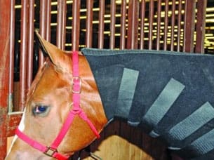AQHA Professional Horseman Chris Arentsen of Trenton, Illinois, keeps a separate set of sweats for each horse in his barn, ensuring a correct fit each time a horse sweats.“A loose sweat will not be effective to get a good sweat,” Chris says. “The sweat should fit snug all the way down the neck, which will keep it in place while the horse is moving and not cause any rubbing to the neck or mane.”Snug is the key word in fitting a neck sweat. It should fit snugly around the horse’s jowl, starting with the first Velcro strip to hold it in place. You should be able to slip a finger between the sweat and your horse’s jowl. Watch your horse, and if he seems to have difficulty breathing, loosen the sweat at the jowl.The neck sweat should reach down to your horse’s withers and be smooth against the neck with no wrinkles. The sweat should end right where the shoulder meets the neck – at that 45-degree angle.When putting the sweat on, make sure it’s laying flat against the horse’s neck as you close the Velcro strips. Chris uses his right hand to snug the sweat against the neck as he uses his left hand to pull up and place the Velcro. Be sure to watch for wrinkles.It is tempting to start at the bottom to Velcro the neck sweat, but Chris says to start at the top. Attach the Velcro strips beginning at the jowl and work your way down the neck, as opposed to starting at the bottom and going up toward the jowl. This will ensure a snug fit all the way down, without having to adjust the Velcro multiple times.Continue reading this story on America’s Horse Daily.Photo Credit: This is a correct fit at the jowl – it sits at the poll and just behind her jaw at the throat. Photo by Bar H Photography.