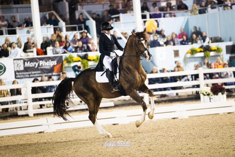 Photo – Up-and-coming young rider, Hope Cooper and Flynn PCH, took home 3rd place in the CDI-W Grand Prix Musical Freestyle (Olivia Airhart, Mane Source Media for Phelps Media Group)