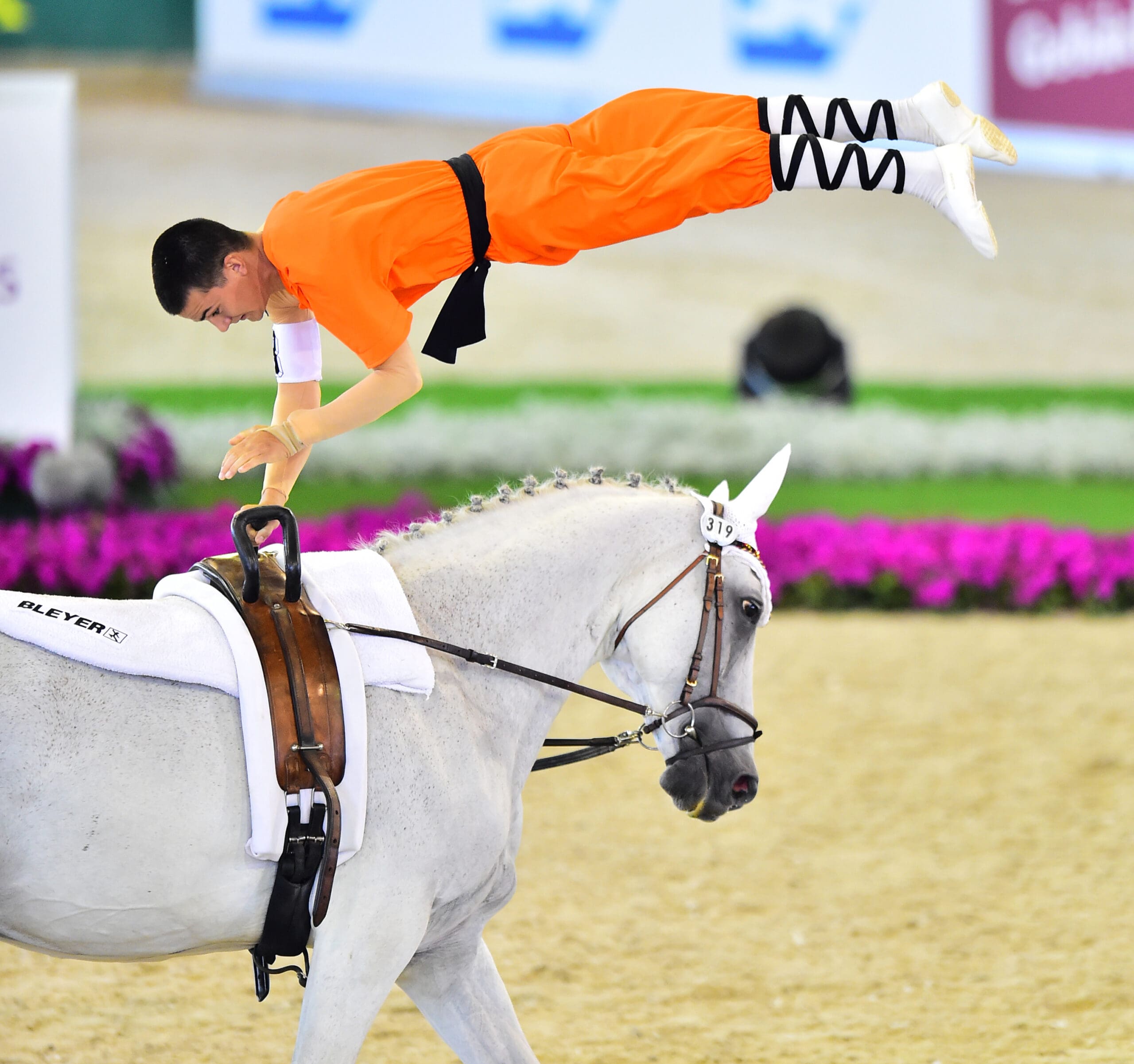The nine pairs in the Pas de Deux were representing seven countries, and former Vaulting superstar, Joanne Eccles, was lunger for the British pair who were first into the arena this afternoon. Eccles, who claimed Pas de Deux and individual gold at last year’s Alltech FEI World Equestrian Games™ in Normandy, France didn’t put herself forward for individual selection for the 2015 Championships, but she has been training Andre McLachlan and Rebecca Norval and their equally inexperienced horse, Norval, who got the competition underway with a score of 5.459.