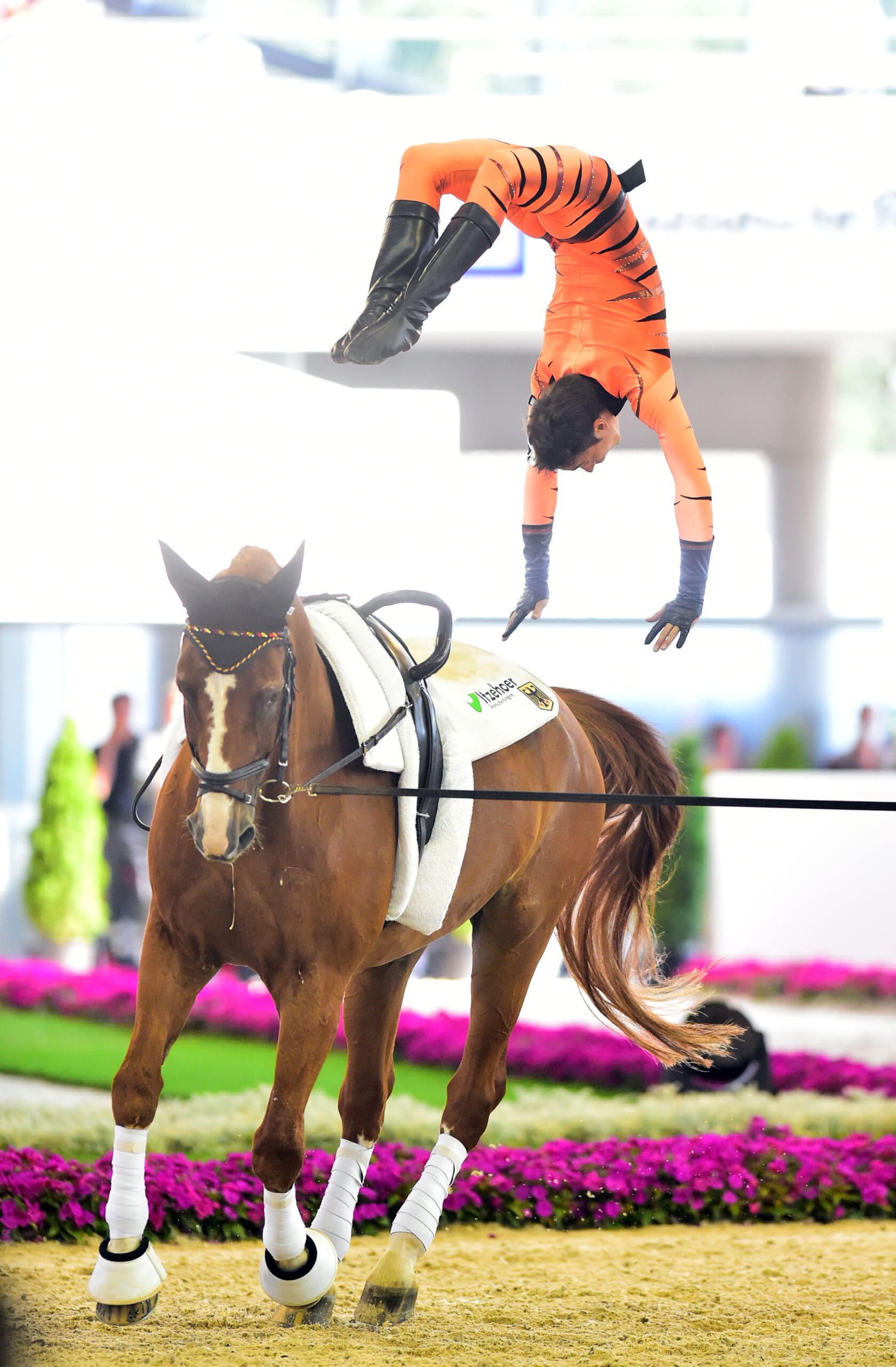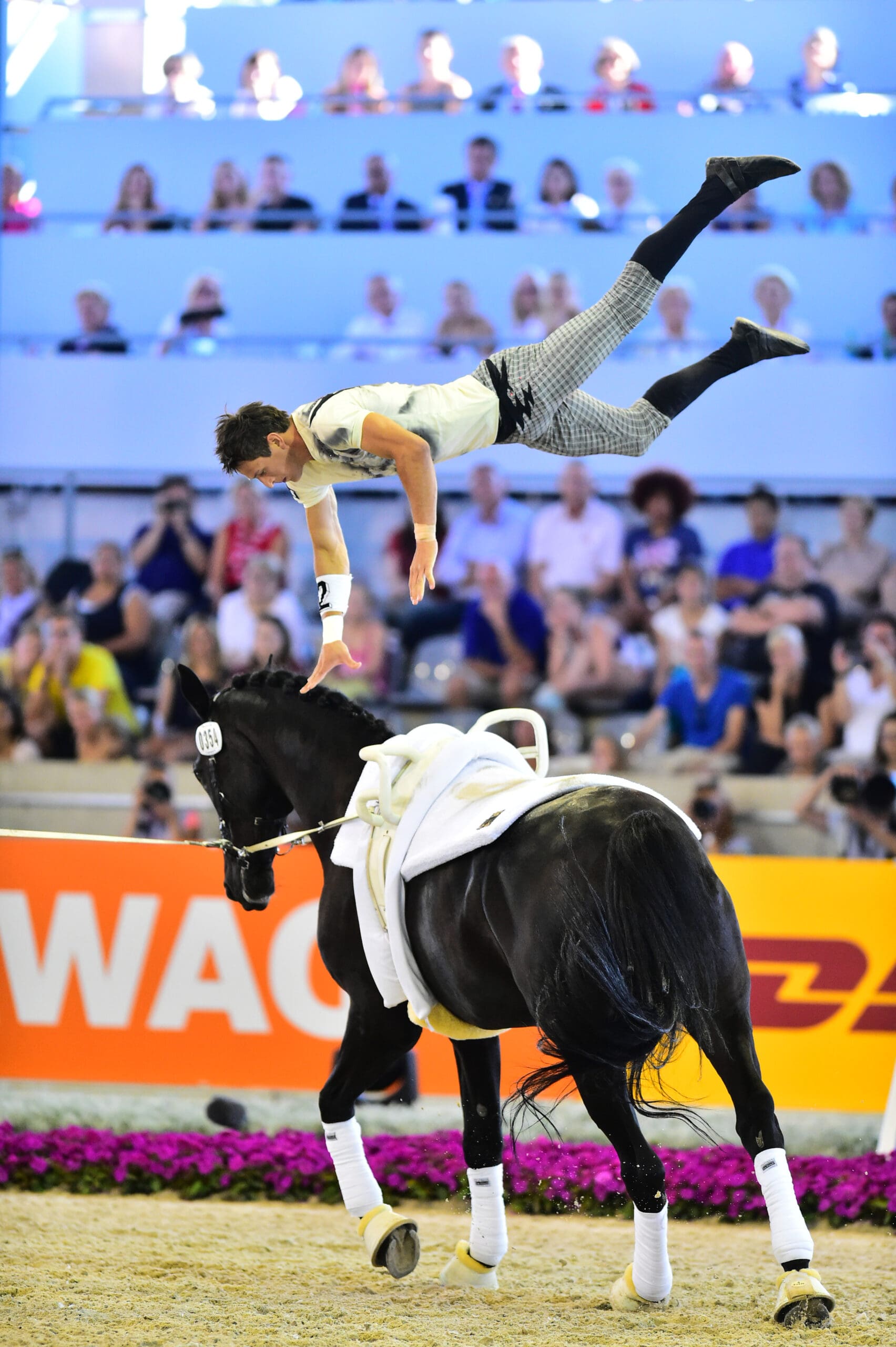 Thomas Brusewitz’s tiger-stripe costume has been attracting plenty of attention and, even with an early mistake, the younger of the Brusewitz brothers went well ahead with 8.563 for his performance. But older brother Viktor presented a routine that was all drama from start to finish. Together with his imposing horse, Rockard, and lunger Winnie Schluter, he brought the crowd to their feet when a mark of 8.563 went up on the board. But the excitement wasn’t over yet.