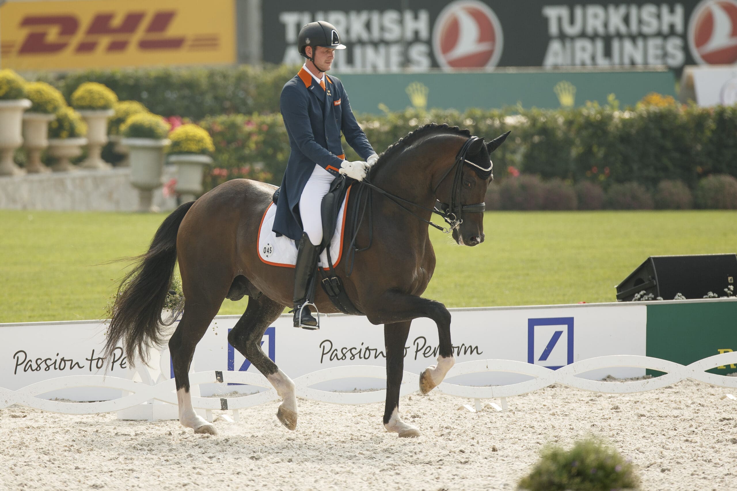The national coach of the Dutch team, Wim Ernes, is “very satisfied” after the first day in Aachen!” “Our first rider, Patrick van der Meer with Uzzo, is on the team for the first time and he put in a very satisfying performance. And Diederik van Silfhout with Arlando did justice to his reputation as the ‘shooting star’. “Ernes had given both riders a ‘tip’ before competing: “I told them to ride like they always do. It is the same competition, the arena is simply somewhere else – namely in Aachen.”