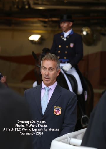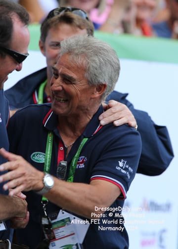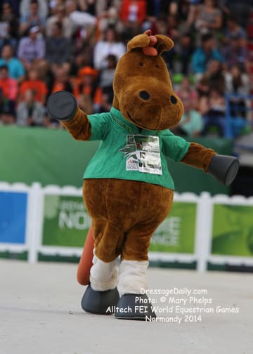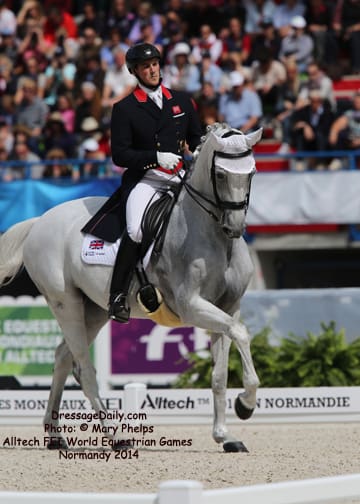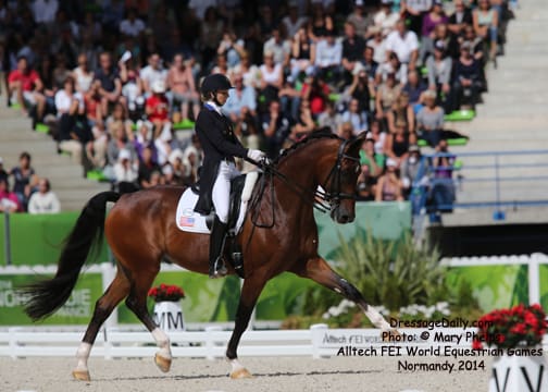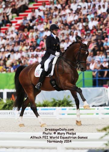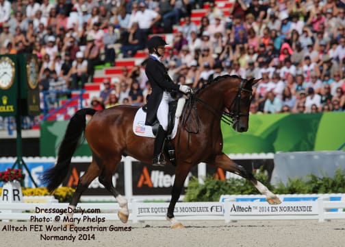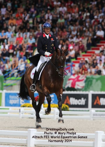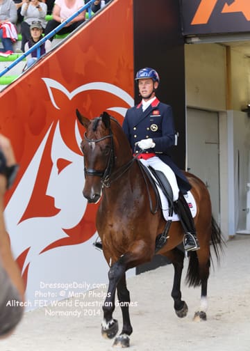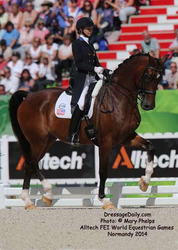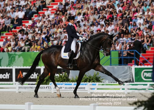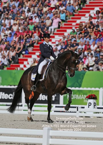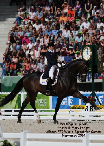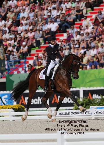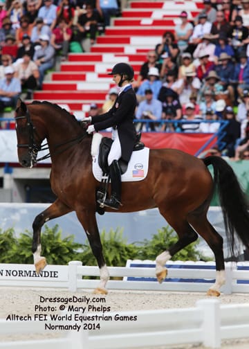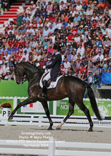 After two solid days of grey and rainy weather, there was the unique opportunity to photograph the Grand Prix Freestyle not only in the daytime, but in the brilliant sunshine. I had found my spot, by the entrance of the arena and when it worked captured images with the brilliant Alltech logo as the back drop. In addition to having a wonderful location to shoot the arena, I was also in front of the “Kiss and Cry” location, where trainers, grooms and family stood in front of the merciless television cameras capturing their reactions of jubilation or disappointment as every move of horse and rider and every reaction to it was recorded. What is always the great privilege and honor of being credentialed media, and to have a 300 mm lens zeroing in on the horse, is that you get a glimpse into their soul. As they enter the ring to the roar of the crowd, and begin their work, my lens is so big that sometimes I just see part of their head, and always their eye. Not a worried eye was seen in the top 15 horses, experienced and also pumped by the crowd. I am often glad for auto focus as my eyes sometimes well with tears as my heart and love for these noble, one of a kind equine souls give not only their riders, but also those of us who share the passion all they have to give. For five long days and nights, they have lived in the barn stabling, worked under whatever conditions they are presented, sometimes during their normal feed time, sometimes very early, sometimes very late. But when you have the best of the best, their spirits soar to the occasion. I am truly blessed to have the privilege of being allowed so close. Enjoy the Grand Prix Freestyle Highlights article by Louisa Parkes, and the Image Gallery by Mary Phelps. If you are looking for Valegro and Charlotte DuJardin, they are worthy of their own page, coming next. – MaryThe Top 14 Dressage Horses in the World Set the Pace for a Record Breaking Finish – Alltech FEI World Equestrian Games™ 2014 in Normandy – Dressage Freestyle by Louise Parkes Morgan Barbancon was first to go of the 15 qualified for today’s Freestyle, and the 22-year-old produced a lovely test to set the pace with Painted Black, one of three 17-year-old horses in the field. The black stallion, formerly competed by Dutch superstar Anky van Grunsven, has established a really nice partnership with the young Spanish rider, and the pair looked relaxed and happy as they racked up the first target mark of 74.393. Hans Peter Minderhoud bettered that when posting 75.554, but the Dutch rider wasn’t so happy. “The horse was confused and thought the test was finished halfway through!” he said afterwards. “It was hard to get him to concentrate but he is still young and needs to develop more power and gain more experience. And we mustn’t forget he made it into the final 15.” Carl Hester was next in with Nip Tuck, and once again the British veteran produced some wonderful work from the 10-year-old bay gelding who is clearly still on an upward learning curve. “There are still a few technical things that need adjusting, obviously, but he is going to grow up and he is such a big hope!” Hester said after his test. “He doesn’t really mind the different situations, the noise and all that. I have a confident horse now. The three extended trots were great, even though they are not his usual highlights. We’ll have a tip top programme for next year!” said the horseman extraordinaire after temporarily taking the lead on 76.589. But his silver medal winning team-mate, Michael Eilberg, quickly took over at the top of the leaderboard when posting 79.696 with Half Moon Delphi. The charming grey mare showed lovely, rhythmical work and increased in confidence every time she entered the arena this week.