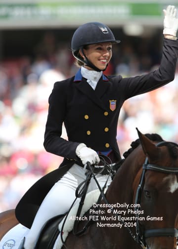 Second Half Evolved The lead continued to change hands and the scores continued to rocket upwards as the second half of the competition evolved. Austria’s Victoria Max-Theurer and Augustin posted the first score over 80 per cent at 81.036 only for that to be improved upon by one of the most exciting new partnerships in action at these Dressage Championships. America’s Laura Graves has appeared almost out of nowhere to place herself amongst the elite of the sport this summer, and her success is all the more heart-warming for the fact that she is riding a horse that cost her just €1,000. Hers is a story of deep dedication and a lot of hard work, and once again today the 27-year-old rider and her 12-year-old Dutch gelding were completely at one when throwing down a great mark of 82.036 in just the third Freestyle of their career. That would prove good enough for fifth place amongst a field of champions. Graves said this evening that her recipe for success is to keep things methodical, and that her result proves “that just being patient and doing what you know is right can get you to where you want to go!” Grand Prix Special bronze medallist, Germany’s Kristina Sprehe, followed with a superb performance from Desperados FRH who simply sparkled to bring the target mark to 83.125. But two horses later, and with just three left to go, Helen Langehanenberg and Damon Hill NRW raised the stakes even higher with a test that was smooth as silk. After Charlotte Dujardin and Valegro, the target was now standing at 88.286, but that was never going to faze Dujardin and Valegro, who arrived into the arena to yet another primeval roar from the crowd before setting off to weave their magical spell once more and put the result beyond doubt when posting 92.196. It wasn’t easy for The Netherlands’ Adelinde Cornelissen and Jerich Parzival to follow. But as the Dutch rider said afterwards her wonderful chestnut horse “feels like he’s seven years old, not 17. He’s amazing and he just keeps doing his best over and over again”. Posting 85.714 the pair easily slotted into bronze behind Langehanenberg, and Cornelissen was filled with emotion because her gelding has returned from ill-health to place himself amongst the best of the best once again at this late stage in his career. “A lot of people said his best days were over, but a bronze medal in the World Championships proves that they were wrong!” said Cornelissen this evening. “It’s not easy to ride after Charlotte, there was a lot of noise but I thought ‘take it easy and just do your own thing’. Now it is just about keeping him fit and happy and he will still be there for the Olympics (Rio 2016). As long as he still loves the games, we won’t be stopping,” the Dutch rider said tonight. And Langehanenberg was also delighted with her result. “This is my first world championships and I’m going home with team gold and two individual silver medals. I’m so proud of Dami, I enjoy him every time I go in the arena and he always does his very best for me. Dami can speak and read. He’s more than any other horse. He’s just perfect. He had the best character you could have.”