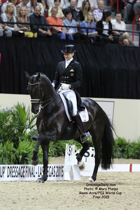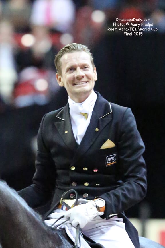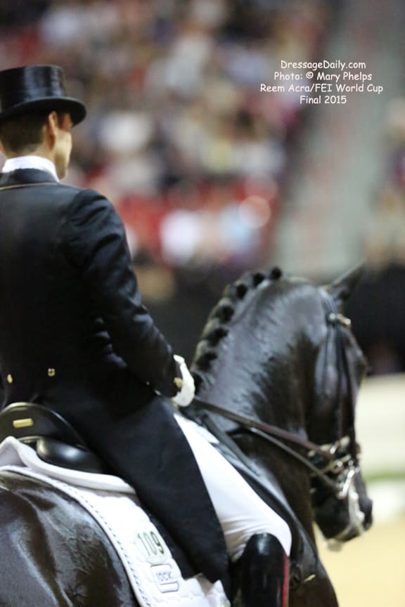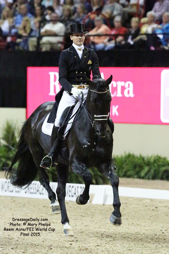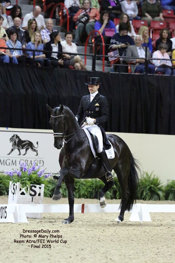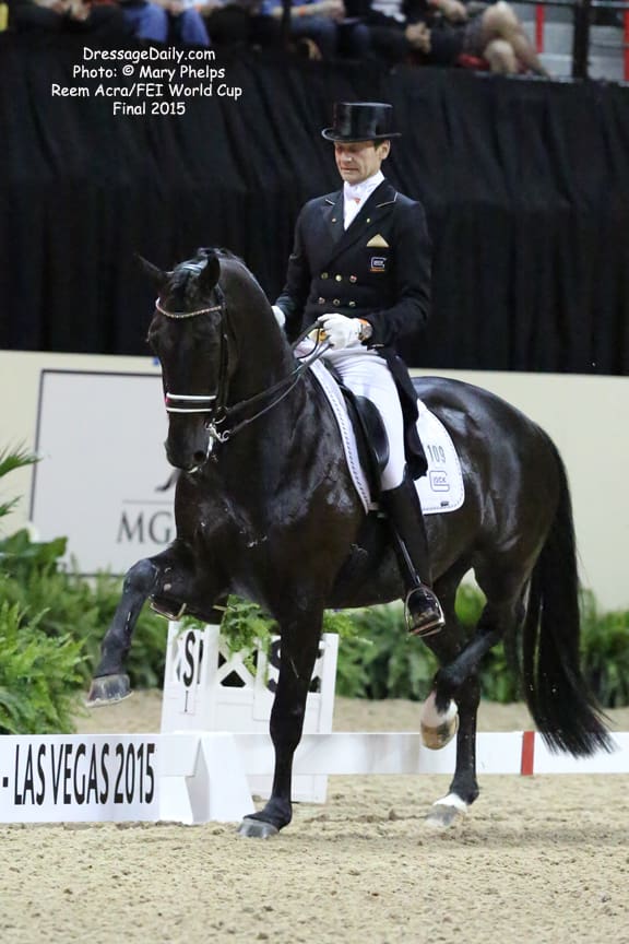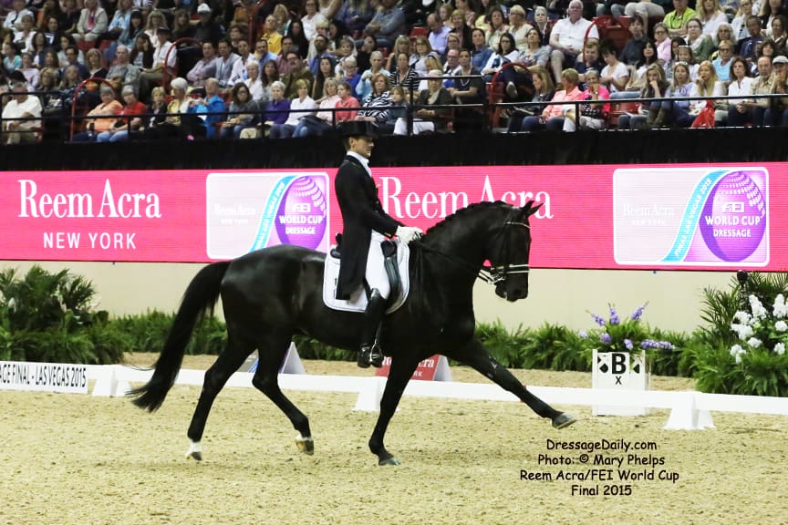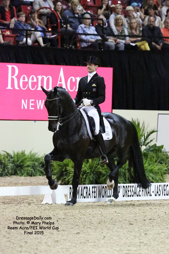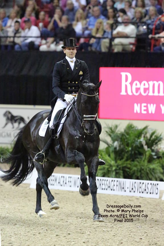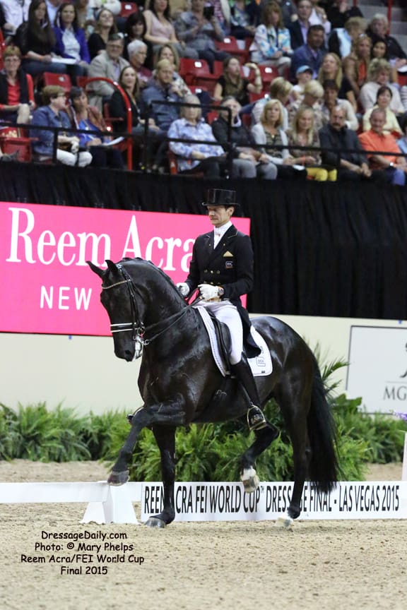 “This is where dressage becomes art,” is what Axel Steiner, retired O judges and official commentator for the 2015 Reem Acra/FEI World Cup Final, Las Vegas, while watching Edward Gal (NED) and Glock’s Undercover N.O.P. The sensitive 14-year old KWPN gelding by Ferro out of a Donnerhall mare and owned by Ghpc Holding Bv. Masterfully ridden by Gal, finishing second place to the unbeatable Valegro and Charlotte Dujardin (GBR) in the FEI Grand Prix Freestyle with a stunning result of 84.696. Former World and FEI World Cup Champion Edward Gal of The Netherlands made his third trip to Las Vegas to compete in his ninth FEI World Cup Final. Gal and Glock’s Undercover, won team Bronze medals at both the 2014 World Equestrian Games and the 2012 Olympic Games in London. View the image gallery
