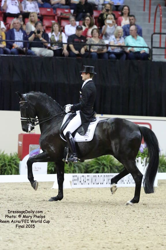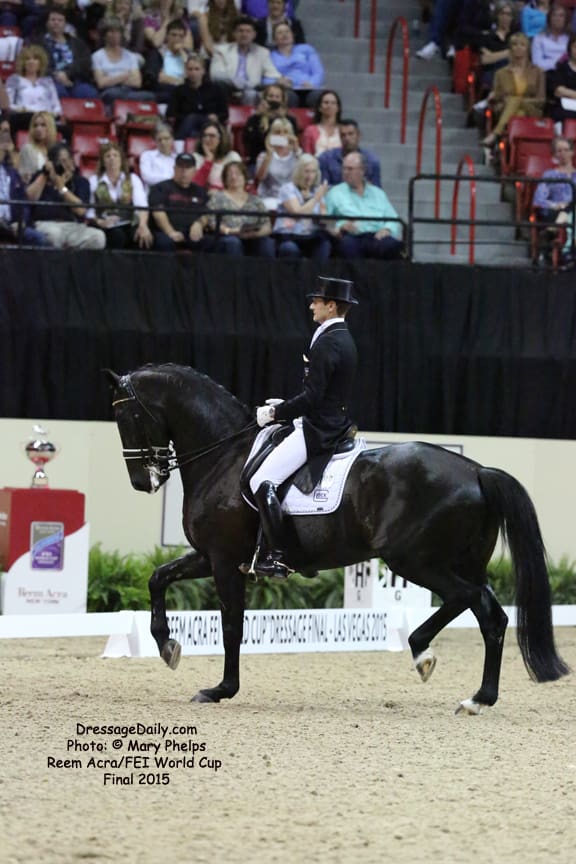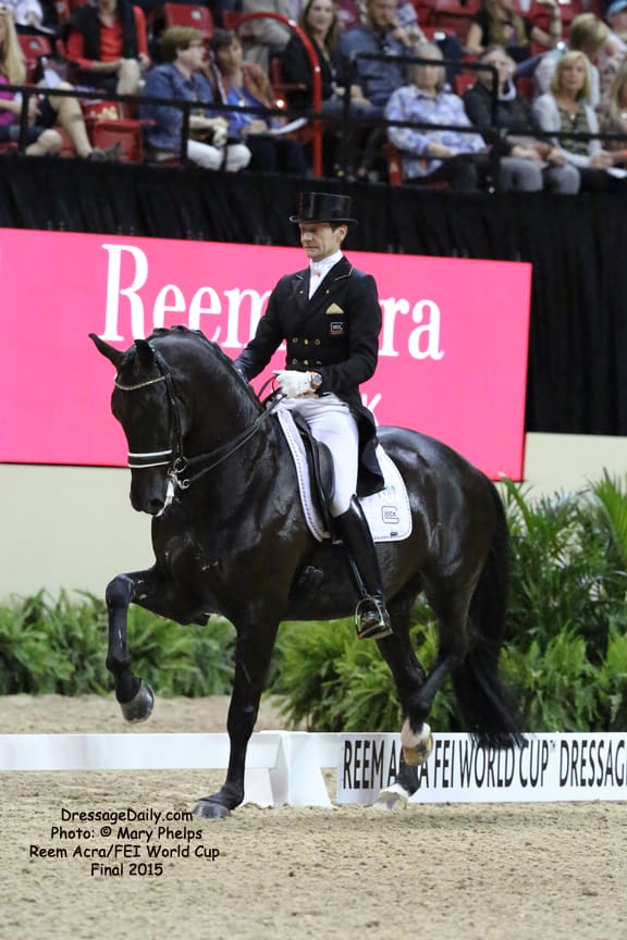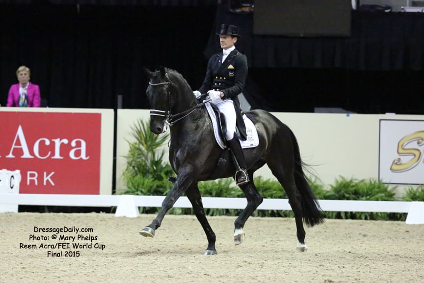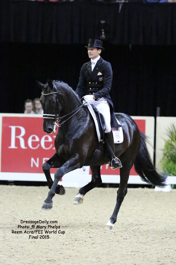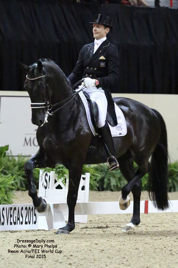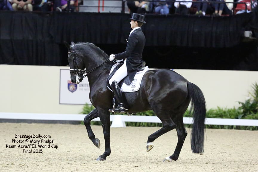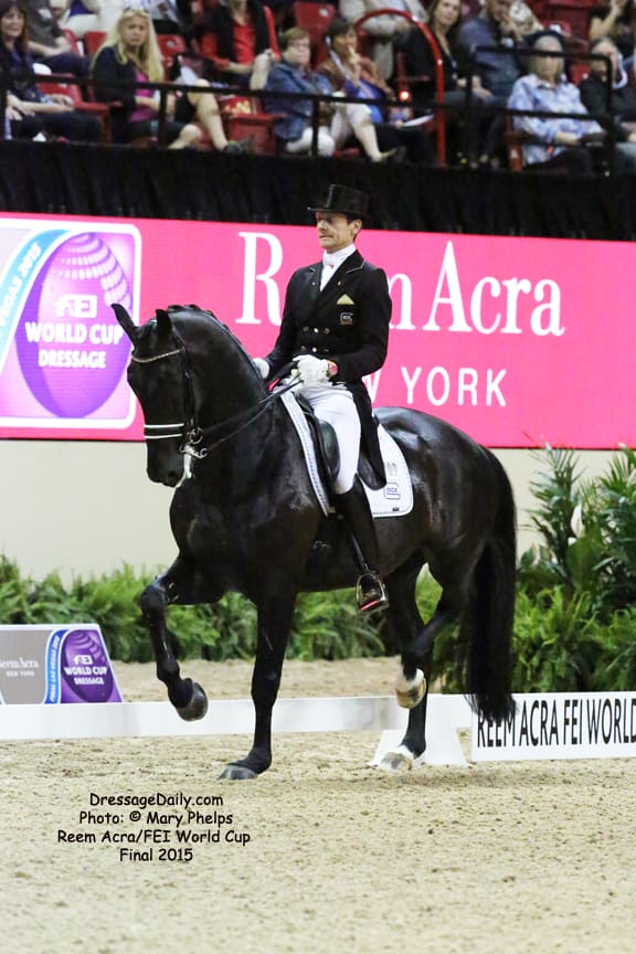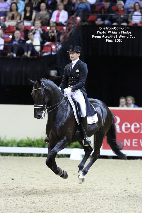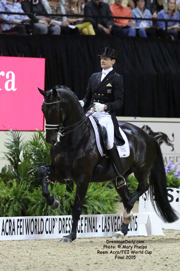 “This is where dressage becomes art,” is what Axel Steiner, retired O judges and official commentator for the 2015 Reem Acra/FEI World Cup Final, Las Vegas, while watching Edward Gal (NED) and Glock’s Undercover N.O.P. The sensitive 14-year old KWPN gelding by Ferro out of a Donnerhall mare and owned by Ghpc Holding Bv. Masterfully ridden by Gal, finishing second place to the unbeatable Valegro and Charlotte Dujardin (GBR) in the FEI Grand Prix Freestyle with a stunning result of 84.696. Former World and FEI World Cup Champion Edward Gal of The Netherlands made his third trip to Las Vegas to compete in his ninth FEI World Cup Final. Gal and Glock’s Undercover, won team Bronze medals at both the 2014 World Equestrian Games and the 2012 Olympic Games in London. View the image gallery