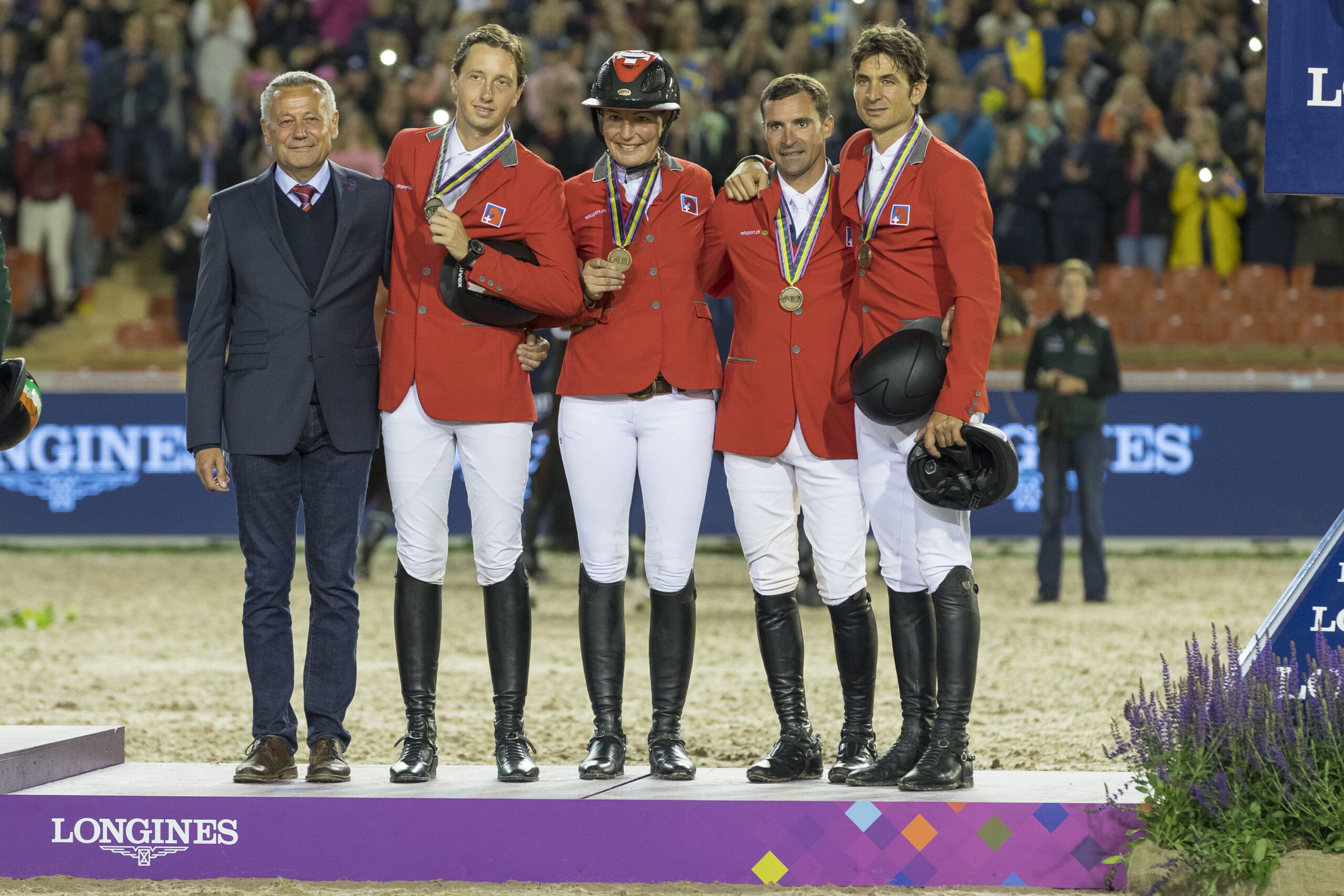 Fourth team member Bertram Allen (22) helped out on the sidelines after withdrawing from the competition following a fall from his grey stallion Hector van d’Abdijhoeve yesterday, but he joined Chef d’Equipe Rodrigo Pessoa on the medal podium as Ireland took the title for only the second time in the 60-year history of these Championships, their previous success recorded at Arnhem (NED) in 2001. Sweden claimed silver and Switzerland took bronze.
