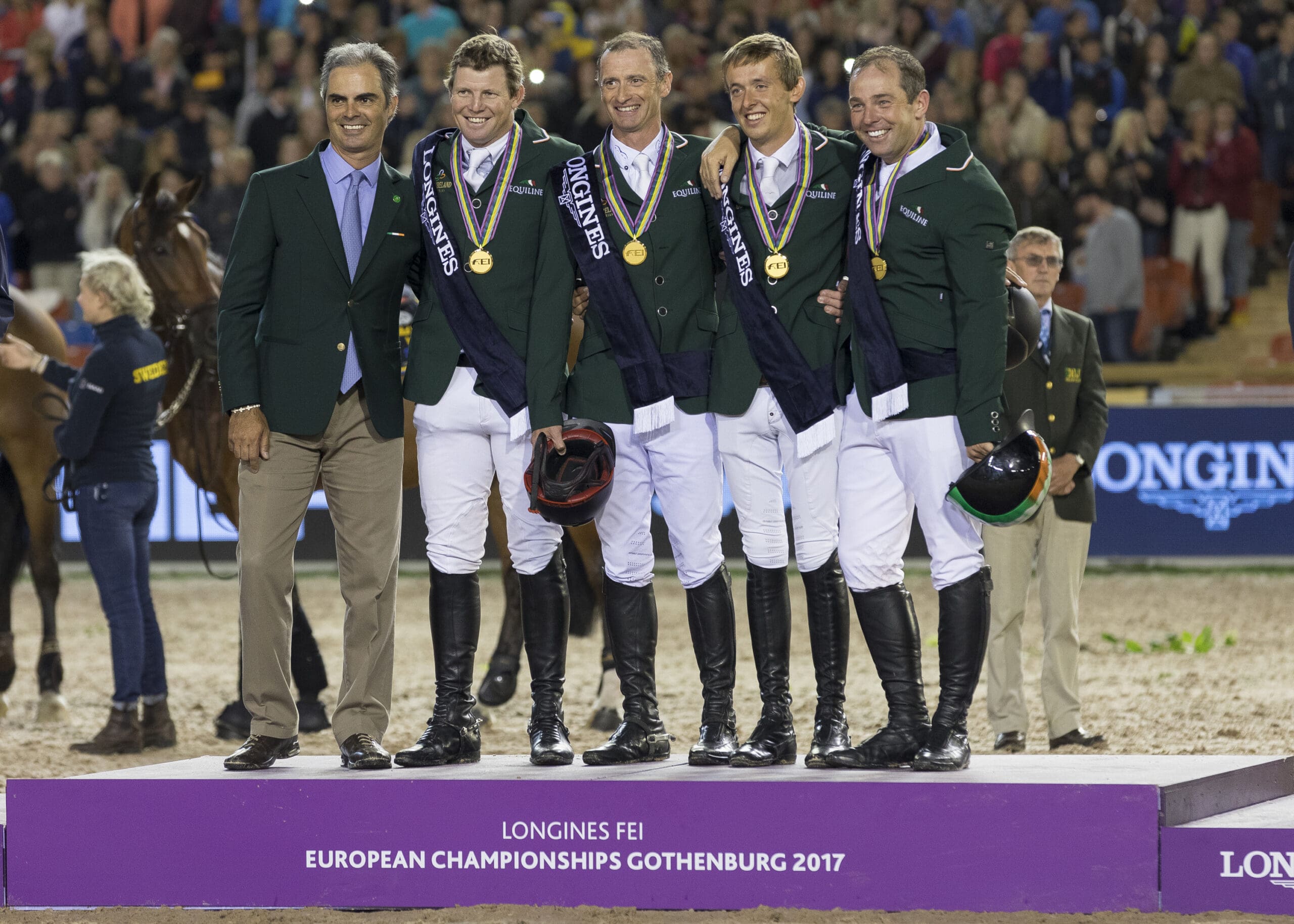 Against the odds, Team Ireland claimed Jumping gold at the Longines FEI European Championships 2017 at the Ullevi Stadium in Gothenburg, Sweden tonight. L to R – Chef d’Equipe Rodrigo Pessoa, Shane Sweetnam, Denis Lynch, Bertram Allen and Cian O’Connor. (Photo: FEI/Claes Jakobsson)