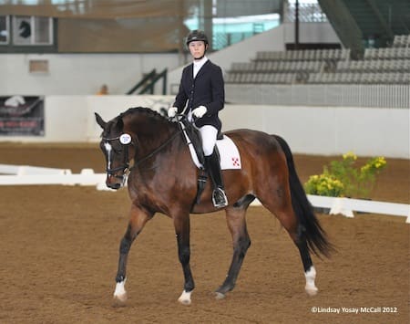 With her recent Selection Trials qualification on Andrea Hart’s Nicolai, Olympian Courtney King-Dye will also be making the trip to Gladstone. The duo achieved their highest score of the weekend in Sunday’s Freestyle with a 69.415%. Courtney expressed, “I was thrilled this weekend; Each day I rode him progressed from the day before and I continued to get to know Nicolai better.” She continued, “The Freestyle I rode on Nicolai is designed for my new horse at home because it contains a lot of lateral work and zig-zag patterns. I had a lot of fun riding my freestyle on Nicolai. After the first day I figured out that my reins were too short which inhibited his movement. I noticed that adding the longer rein, although it may look a little sloppy, gives Nicolai a better top line, a better frame, and it makes him relax. I am now looking forward to taking what I learned in Houston and applying it to my work with my new horse, Buddy.”