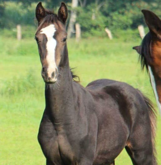 - Two weanlings recently shipped to Maplewood’s New York facility from Germany. MW Derringer is a 2015 Premium Dark Bay GOV Colt (Dante Weltino x Dylano x Sir Donnerhall I x De Niro x Rubinstein) bred by A. Weighaus, Vorwerk. He will be raised as a stallion prospect. MW Mona Caron (Goldberg x Sir Donnerhall I x De Niro x Rubinstein), also bred by Weighaus, is a 2015 Premium imported GOV filly. She is one of the first by Goldberg in the United States. Both weanlings are from the damline of the 2015 Reserve Champion Stallion in Oldenburg. This famous Silberranke (Hannover Stutenstamm 4193502 (Schridde 1149)) damline has produced numerous licensed stallions and top mares.