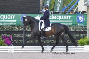 The German-born Orlob, who now rides for the USA, spearheaded a clean sweep of the top three places by the home nation. Nicholia Clarke rode the Komsi Komsa Syndicate LLC’s nine-year-old Apache gelding Komsi Komsa to 68.676% and the second qualifying place. The USA’s Hannah Bressler Jaques filled third with a 66.716% ride on her own 10-year-old Ferdeaux son, Jim.