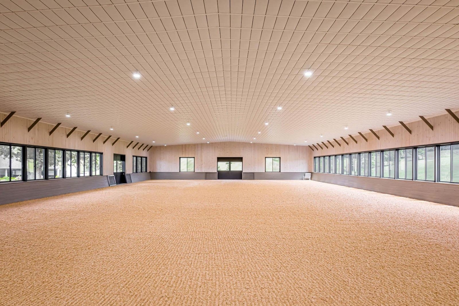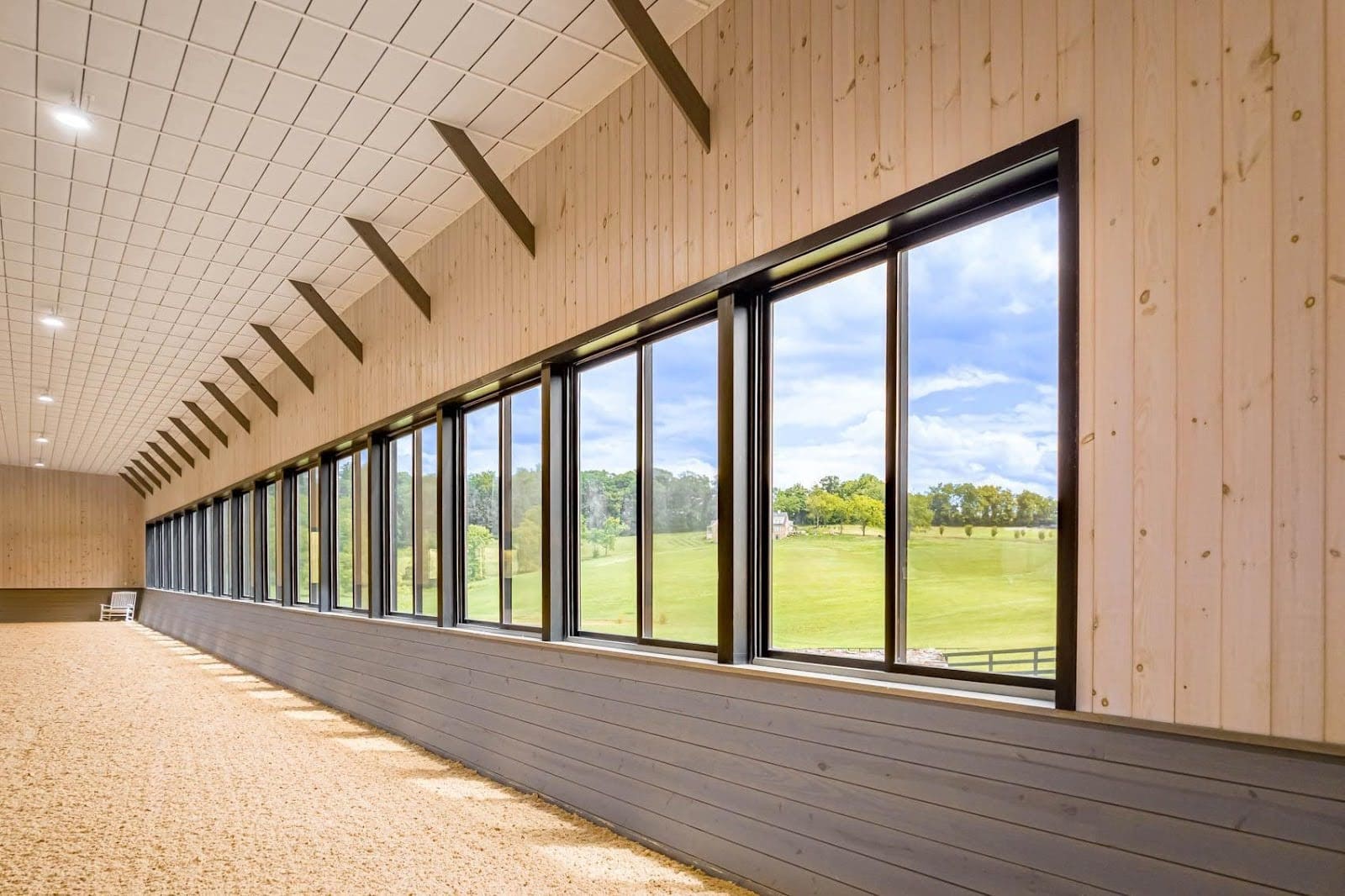 Quarry View recently completed this gorgeous light filled 90’ x 200’ indoor riding arena in Middleburg, Virginia. Only steps away from the beautiful horse barn, the indoor riding arena features 39 – eight foot by eight foot windows that provide an unobstructed view of the stunning rolling fields. With a carefully selected light colored equine footing, and a white ceiling, even on cloudy days it still feels bright. The use of specialty trusses allowing the center to be three feet higher than the 18 foot sidewalls and a soft color scheme makes this arena a standout. This indoor riding arena is built to last. The James Hardie board and batten siding will make maintaining this indoor riding arena a breeze.