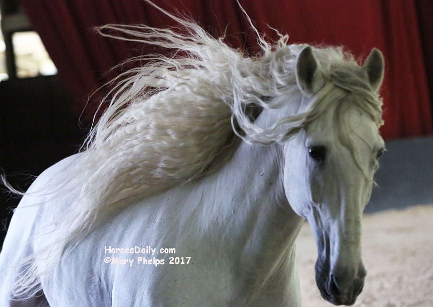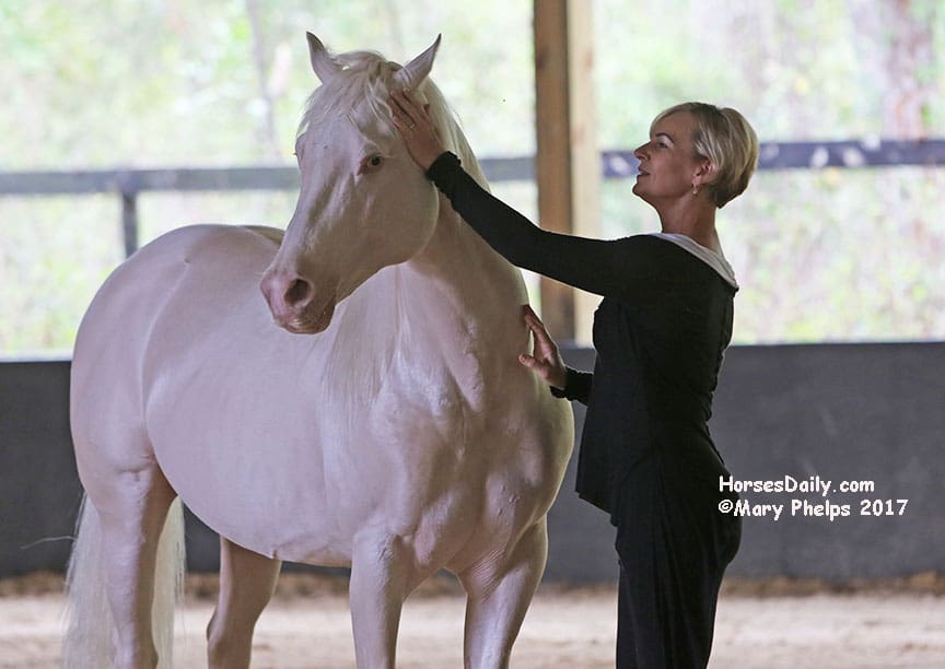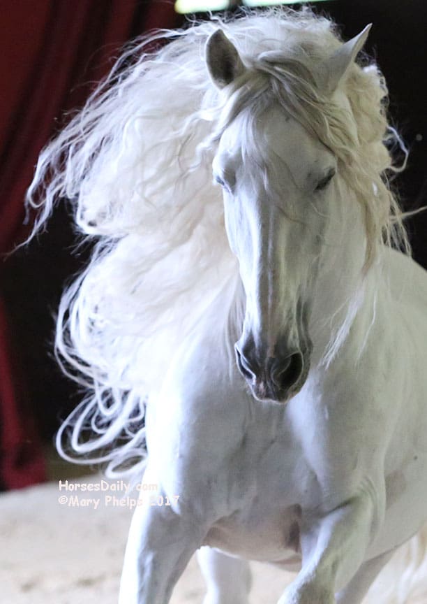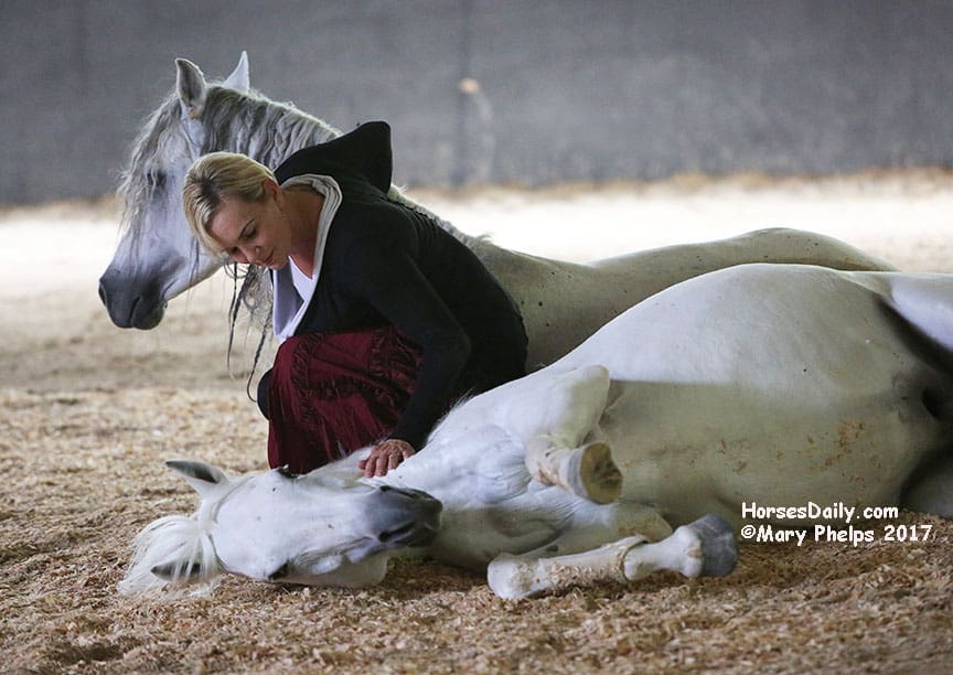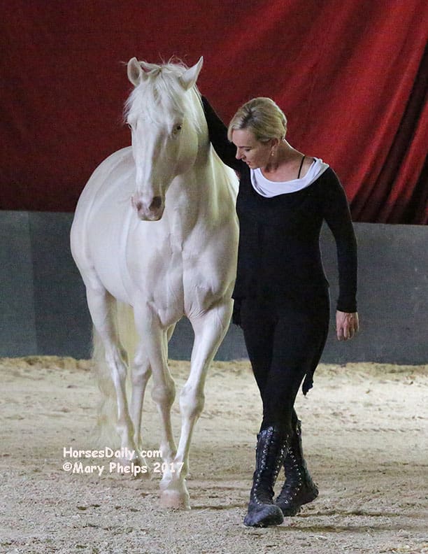 As a child, the petite Zerbini had the job of turning out her father’s circus horses, mostly stallions on their farm in France. She would stay with them and observe their communication with each other quickly picking up on movement, eye contact and horse language. From this fascination grew her talent and instinct, and the result is love and magic.