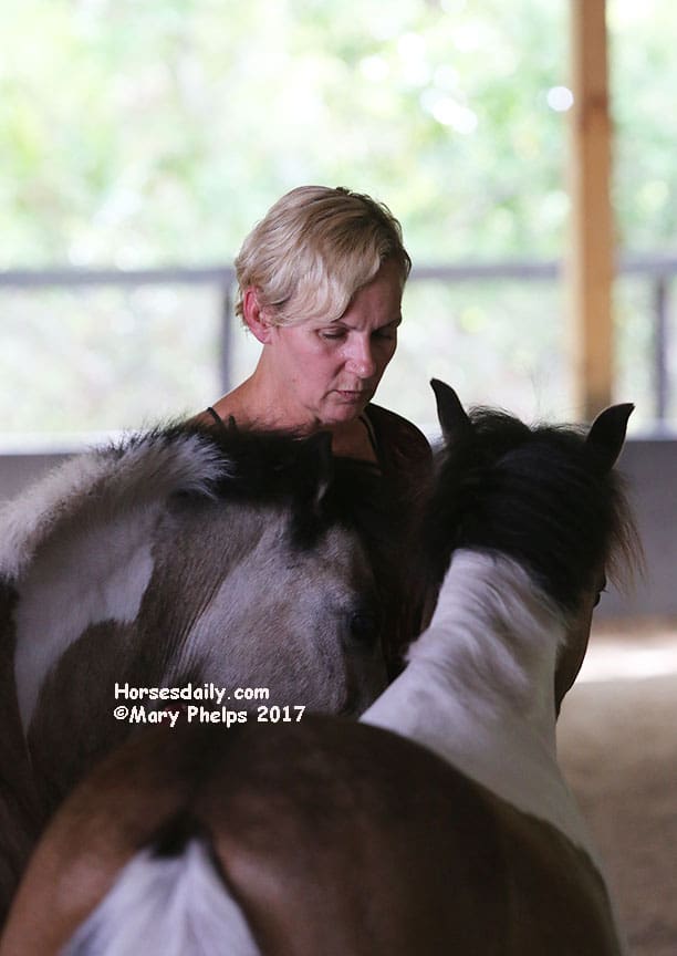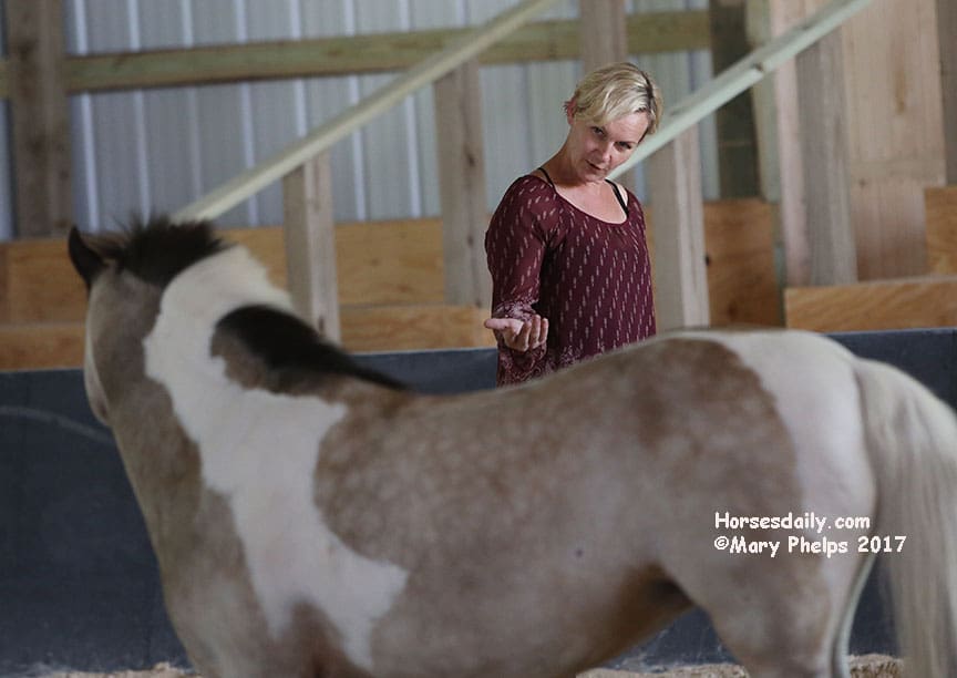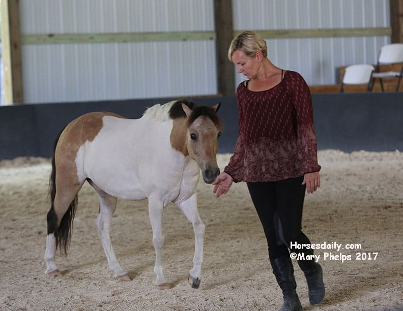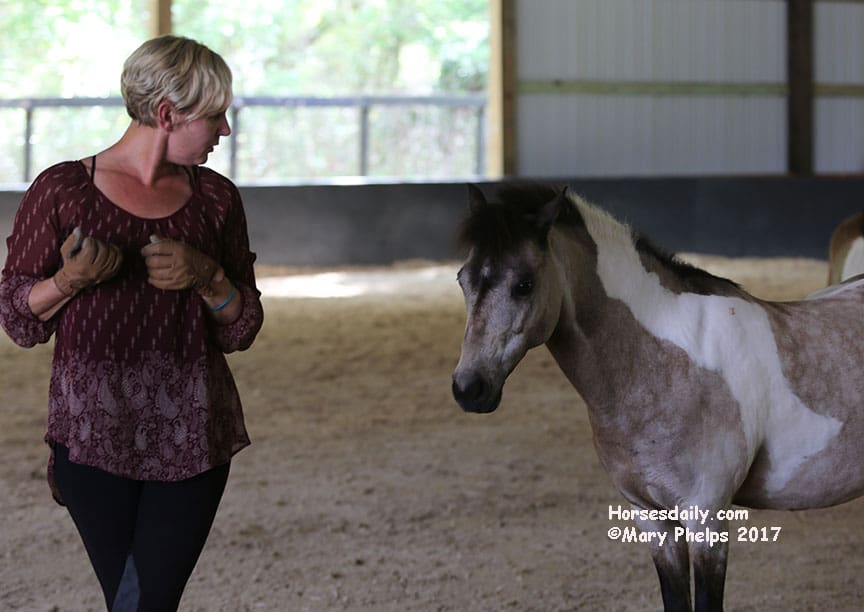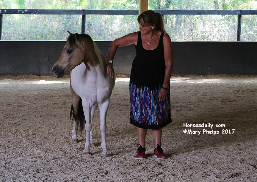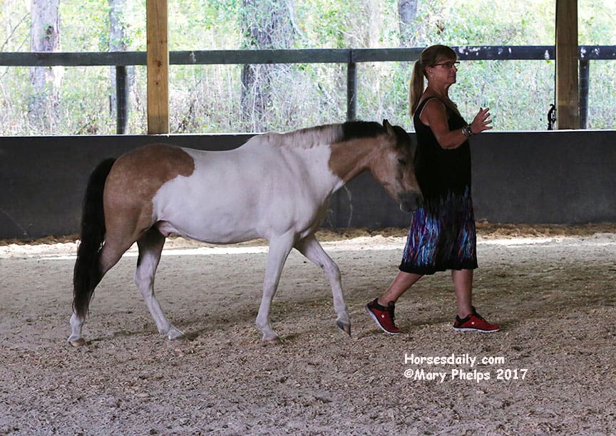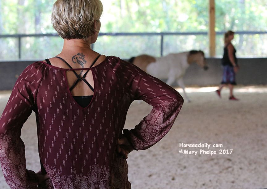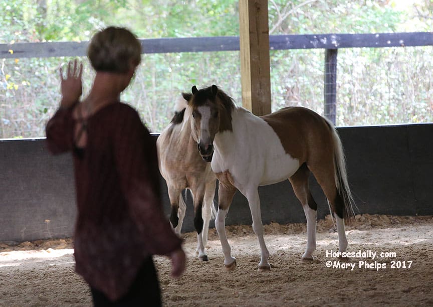 She then took each pony individually and did the same. Towards the end of the two hours, we were on information overload, as we tried to observe and absorb all we were listening to. Then I came in the arena with her, and just worked with Bugsy (who she said was the most confident – who knew?) as he walked beside me, and turned with my hand movements, which were meant to communicate “like a horse’s neck”.