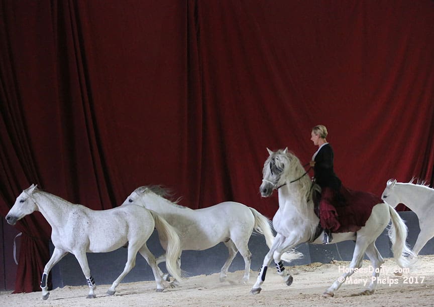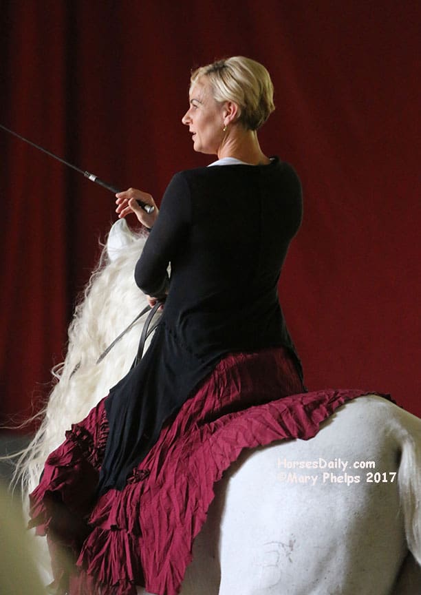 In part of her performance, she rode on her stallion, with 12 horses all free circling her and responding to her gaze with intricate movements and choreography.