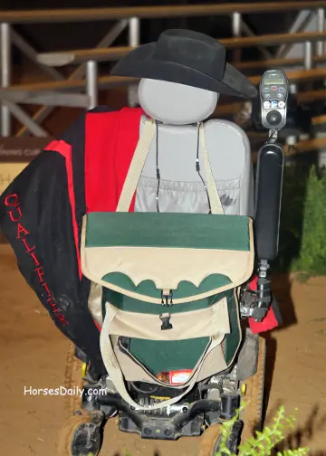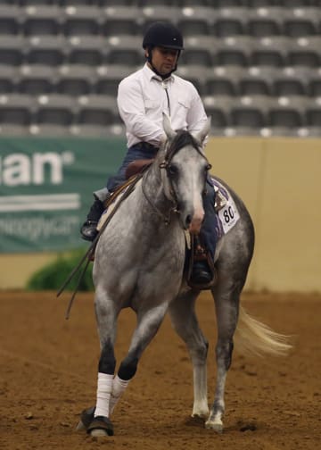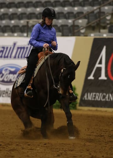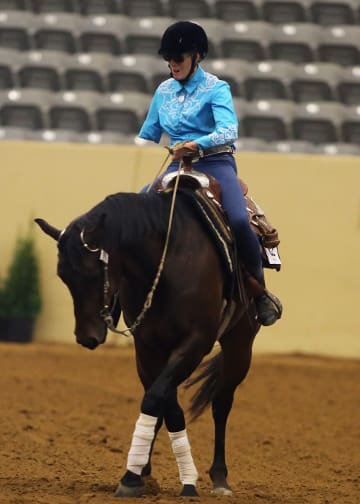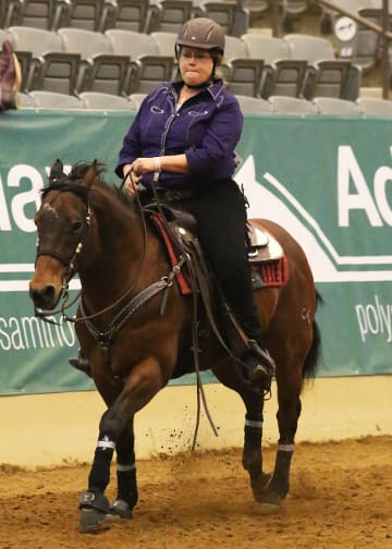 A very special competition made its debut April 26, at the Kentucky Reining Cup– Para-Reining. Five riders with disabilities-most of them from the world of para-dressage-contested the class. Lise Yervasi who traveled from oregon to meet the challenge, came out the victor, scoring 72.00 aboard Lexi Stoval’s Dolano Glory Rey CT. In second was Dale Dedrick with a 70.5 aboard Dan James’ Smart Little Elan, and Holly Jacobson with Tamra Kyle’s Zins Smart Wrangler was third with 70.0. Para-Reining is a new class with in the sport of reining, but it is quickly catching on. “This was challenging because it is so new to us,” said class organizer and FEI reining competitor Lisa Coulter. “We just weren’t sure how the horses would respond to these riders-we had no framework to work from, but it was amazing how these horses responded and adapted. These horses suit a lot of riders because they’re shorter and smaller-strided.” “I’m a grade 1b in [para-dressage],” said Dedrick. “So I only walk and trot. I have not cantered a horse in more than 18 months, and I was a little leery about the idea of a canter test, but [competition manager] Brad Ettleman said, ‘Oh no, the Western lope is more comfortable, you’ll like it.’ And then [James] and his horse Top Gun convinced me to try it and it was great.”