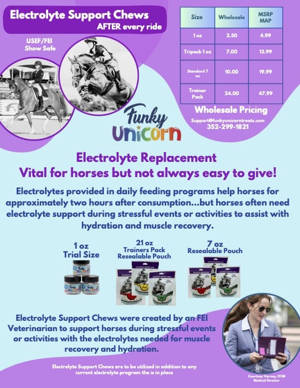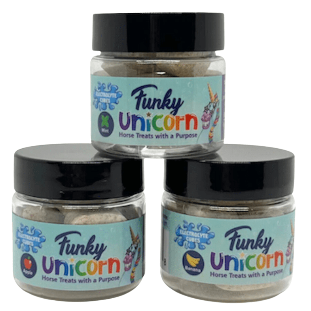 As horse owners and medical providers, Renee and Emily Genther wanted a show safe and easy way to help their horses “want” to hydrate and to help them with muscle recovery post-workout by adding electrolytes to their sugar treats. This increased their water intake and helped with their overall recovery and performance. Living, working, and riding in the Ocala region of Florida, the need for hydration drove the mother and daughter team, who are both professional nurses to seek solutions for equine wellness, and Funky Unicorn Chews was born!