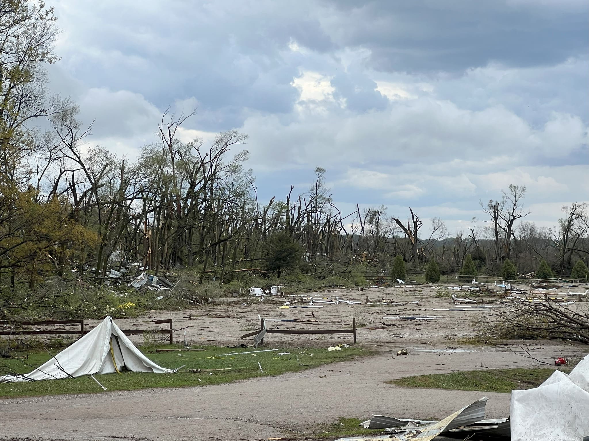 We have extensive roof damage, siding and window damage, portable stall damage as well as show stall roof damage. Our indoor arena is now an open air arena with approximately 25% of the building missing. Most of the indoor footing will need to be replaced due to the amount of debris from the destruction. We lost a turnout shed from the pasture. Our judges booths, starter booths, and show office destroyed. The home on the property is a total loss also.
