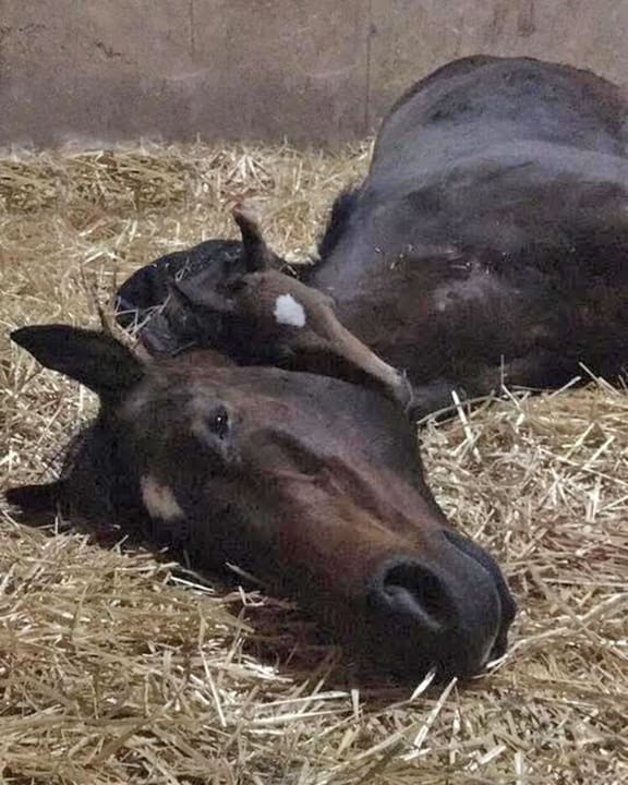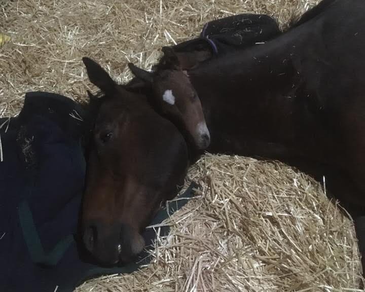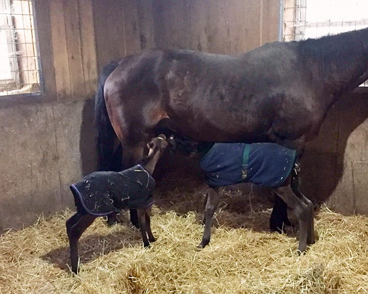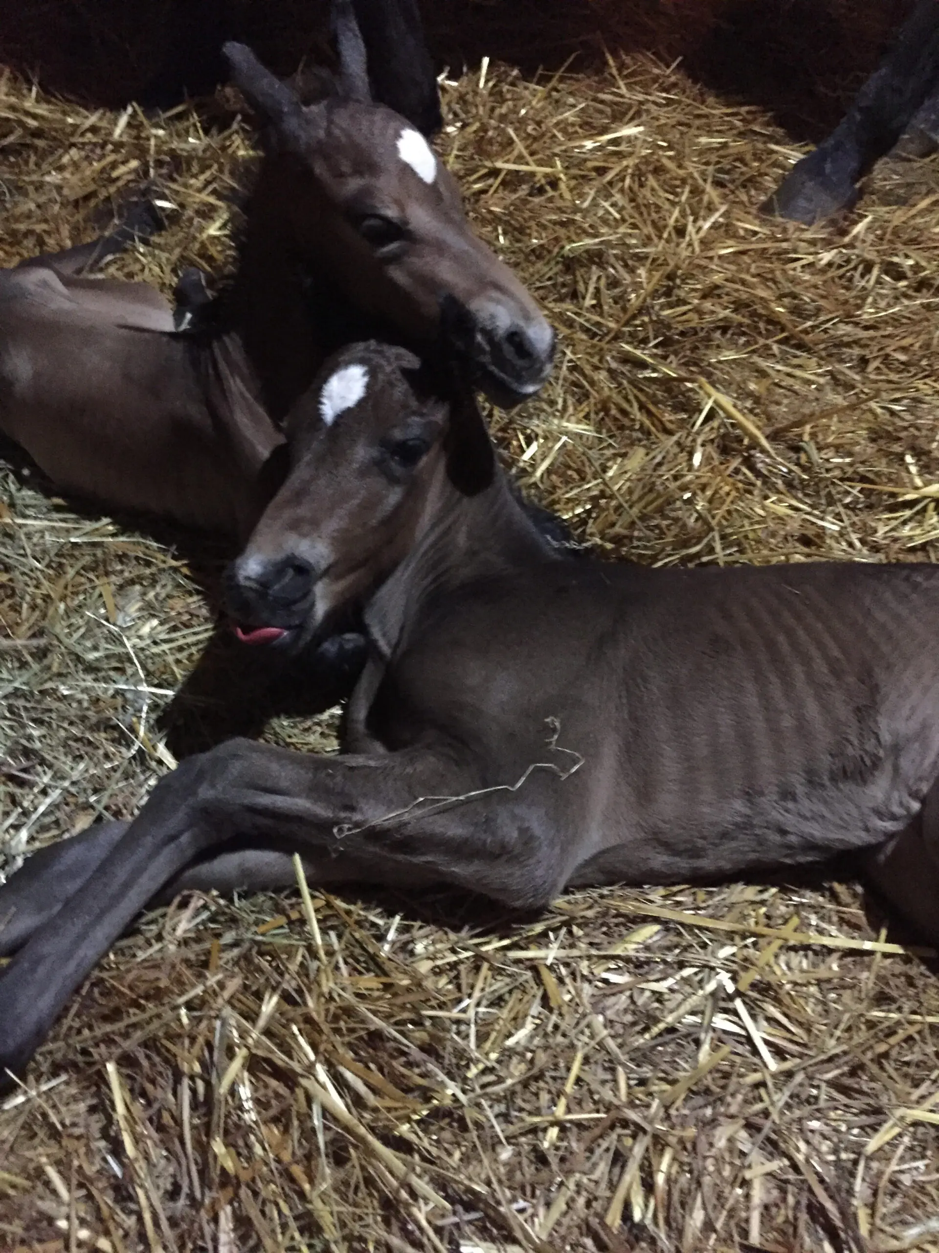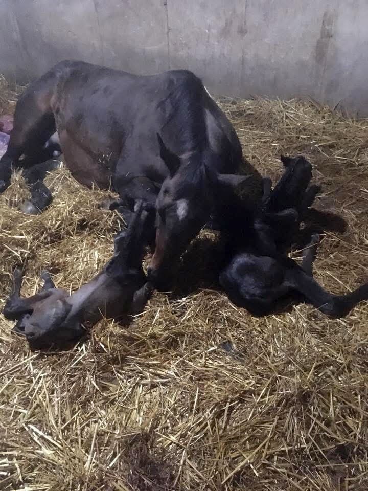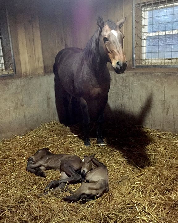 An early ultrasound and normal pregnancy indicated all was well. Jenna, her trainer Britt Heggland and the team at Hollow Hill awaited the arrival of Jenna’s new foal. Then on April 28, at 1:20 in the morning they were in for a big surprise.