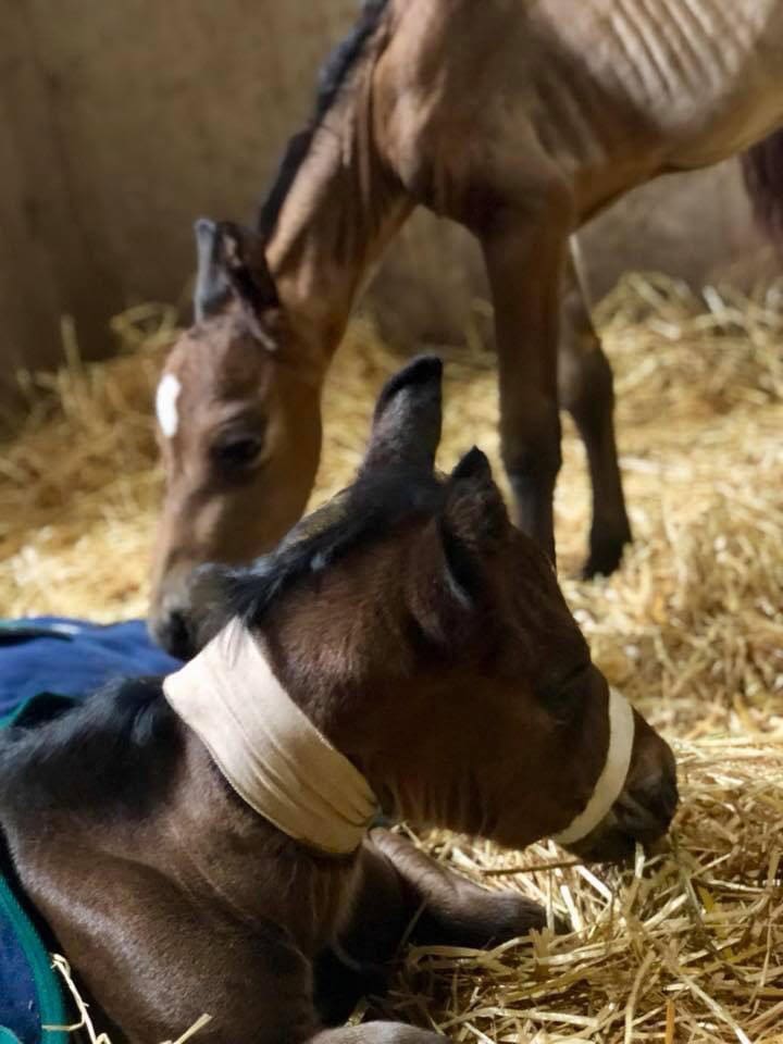 Finally, with the success of the vet administering plasma, IV fluids, antibiotics, etc. both foals are thriving. Lord and Taylor are nursing off of Prada, walking, receiving antibiotics, and getting up on their own.