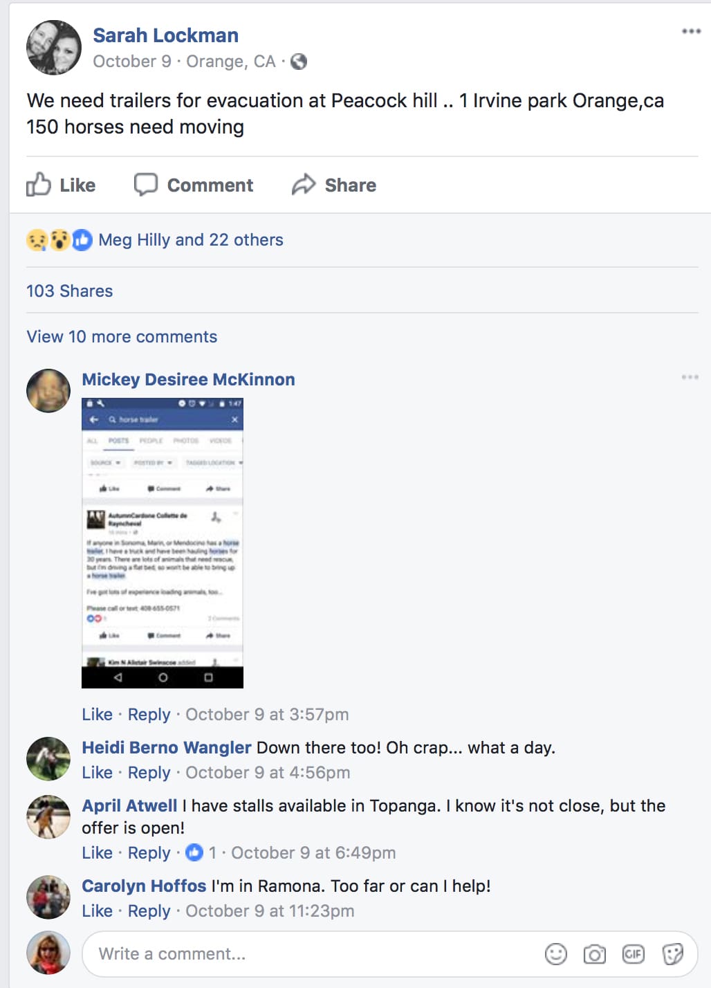 The wind-whipped flames caused freeways to be closed in both directions, leaving humans and horses at Peacock Hill virtually trapped. The parking lot of an Albertson’s supermarket nearly a mile away became a de facto staging area, and Lockman turned to social media, putting out a distress call on Facebook: “Walking horses to Albertson’s parking lot,” she posted. “Please come with trailers.”