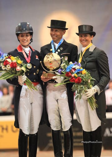 Wellington, FL – Steffen Peters of the United States successfully defended his World Dressage Masters Palm Beach title on Saturday evening when he rode Ravel to his second consecutive Exquis Grand Prix Freestyle win.  But it wasn’t an easy victory. British challengers Charlotte Dujardin and Valegro came within five one hundredths of a percentage point of toppling Peters from the center of the podium. “I had a great night with Ravel, but I watched Charlotte after our ride,” said Peters after the awards ceremony. “When she came out of the ring I went over and said to her, ‘I think you’ve won it.’ It is exciting to be that close to another of the world’s top horses and riders.” Peters and Akiko Yamazaki’s 14 year old KWPN gelding had received a score of 83.7%, which kept them ahead of Dujardin and Valegro, a ten year old KWPN gelding owned by Carl Hester and Roly Luard, by the tiniest of margins; the British pair received 83.65% for their performance.