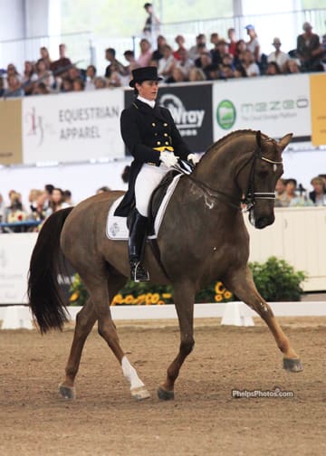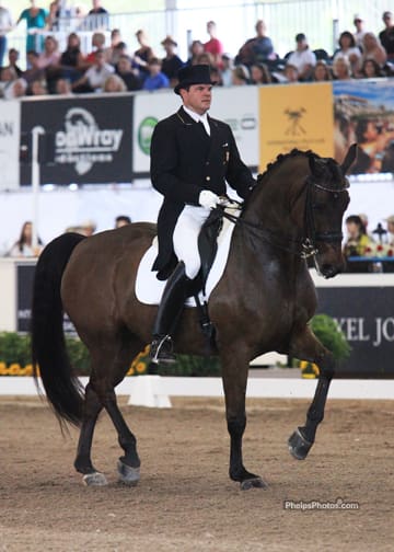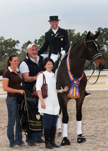Check out the Video of Steffen and Ravel’s Record Breaking Ride, and image gallery of all competitors! Wellington, FL – American Dressage super star Steffen Peters took a step toward defending his 2011 World Dressage Masters Palm Beach title by winning the WDM Palm Beach Nürnberger Grand Prix test with a record-shattering score of 81.383%. Not only is that a personal best result in a CDI Grand Prix for Peters and Akiko Yamazaki’s 14 year old KWPN gelding, it is also the highest score ever attained in a WDM Palm Beach Grand Prix. “I started to have the feeling I got from Ravel tonight in the last couple of weeks,” said Peters after his decisive victory over the international field of 16 competitors. “I had this feeling at a show two weeks ago in California, but I had to risk it a bit more here. Ravel feels even stronger than last year and more supple. It was a blast to ride.”
