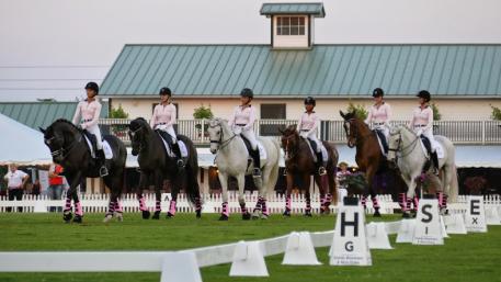 Wellington, FL – As 12-year-old baton twirler Kayden Muller led the procession to the piping tunes of Shirley Temple Black, the pink motif customary at the 2015 Challenge of the Americas (COTA) event was carried a step further, literally, as Team Showchic’s 20 dressage-connected volunteers shaped a giant pink ribbon on centerline. Signed by spectators honoring the names of cancer survivors and loved ones in remembrance, the tribute conveyed the very real message that we are all in the fight against cancer together. Team Showchic’s riders, Mary-Cameron Rollins, Annie Peavy, Hannah Michaels, Klendy Muller, Jessica Rhinelander, Ariana Chia, alternate Alexandra Duncan, rode to powerful music all written and performed by cancer survivors like Melissa Etheridge, Sheryl Crowe, Olivia Newton-John, Shirley Temple Black making a strong impression on everyone present.