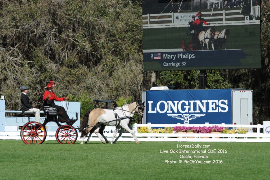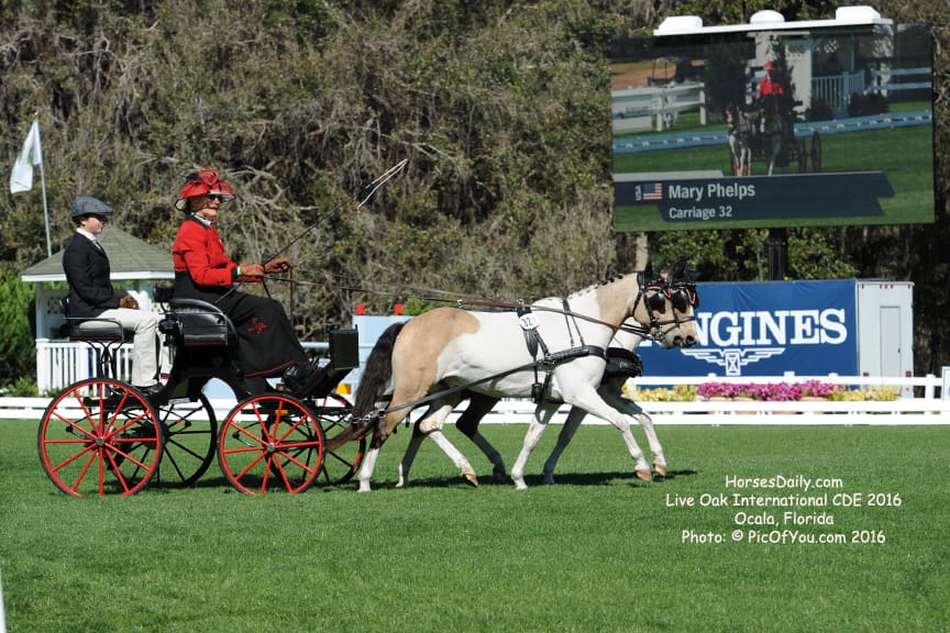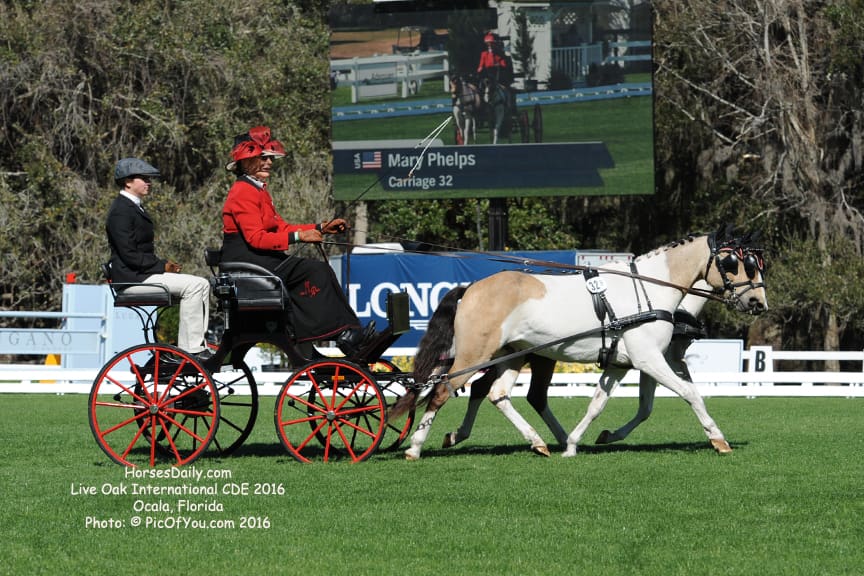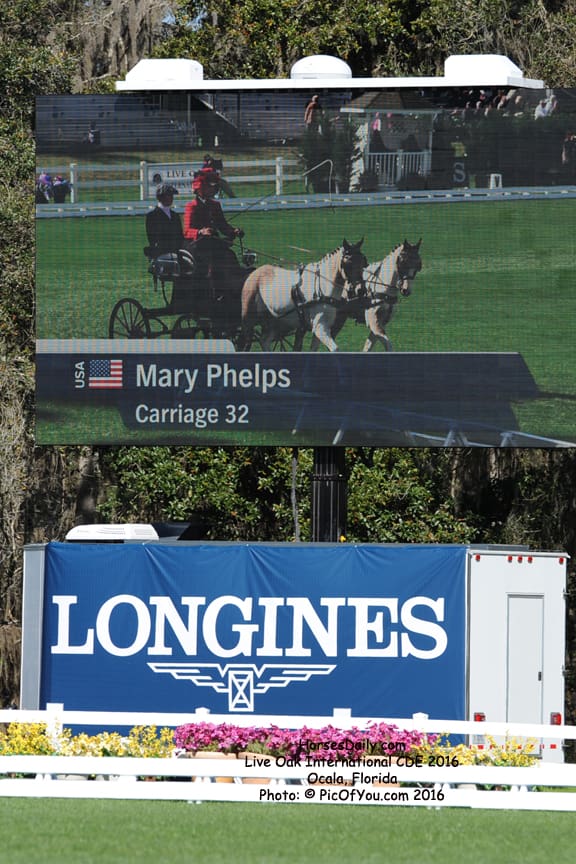 While we are still eluding the blue ribbon, each event we keep getting stronger and faster. We dominated in three of the marathon hazards as the fastest in the division. Proud of my little hotties for handling the international arena in dressage, we put in a respectable dressage test in front of a tough panel of European judges. Kate McIntyre who was riding on the back seat as the groom couldn’t help herself and kept looking at us on the Jumbotron. I even mastered the one handed loop without dropping a rein or having to reach to adjust. Kate said she kept thinking “Hang on Mary, hang on,” as it was a little hairy in the first loop. A broken finger that never healed right has been my nemesis for this movement required in most Intermediate Tests. The test demonstrated 3 trots, collected, working and lengthening, and transitions need to be clearly defined. My ponies have Hackney blood, and because of their size and breeding it has taken work to develop a trot that look correct and not hectic.