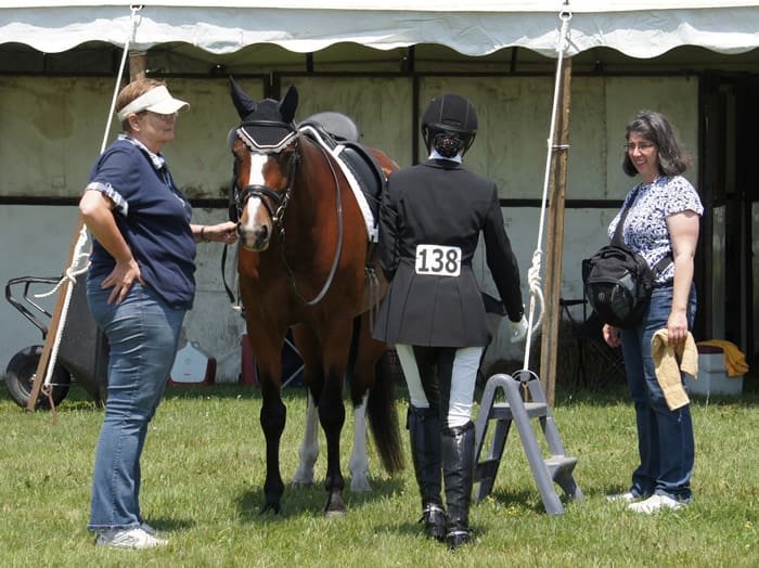 The show management, Lyn Kendall, Marilyn Farhinger, Whitney Peterson and Maureen Sharp did a fantastic job helping the kids understand the format, as they answered any and all questions with a large smile on their faces. The announcer, Jim Guthrie traveled from Chicago to be a part of this wonderful event. Barbara Moss – the Horse Inspection Judge did exceptional job checking equipment, sending the youth to the indoor warm-up arena where the roving trainers helped to prepare the youth for their dressage tests.