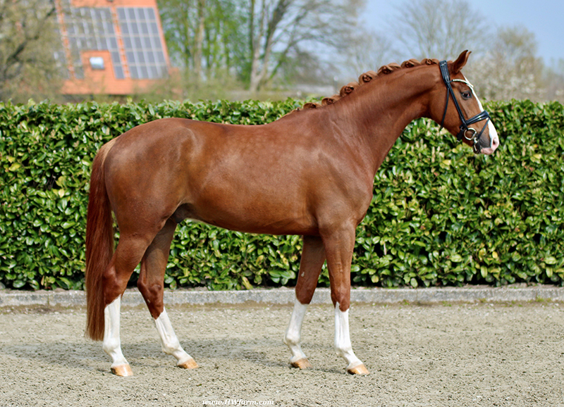 Fürst Quotenkönig HW’s dam is by Quotenkönig, Vice Bundeschampion 2012, Westphalian Champion 2012, 2013 and 2014. BundesChampionat 2015, 4th place, WorldChampionship 2015, 8th place in the final round, victories in 3rd and 4th levels, WorldChampionship 2016, 4th place, multiple S & M Dressage victories,, liver chestnut Westphalian Stallion, by Quaterback – Fürst Piccolo – Sandro Hit – Contender – Landgraf, born 2009, standing approximately 16.2 hands.