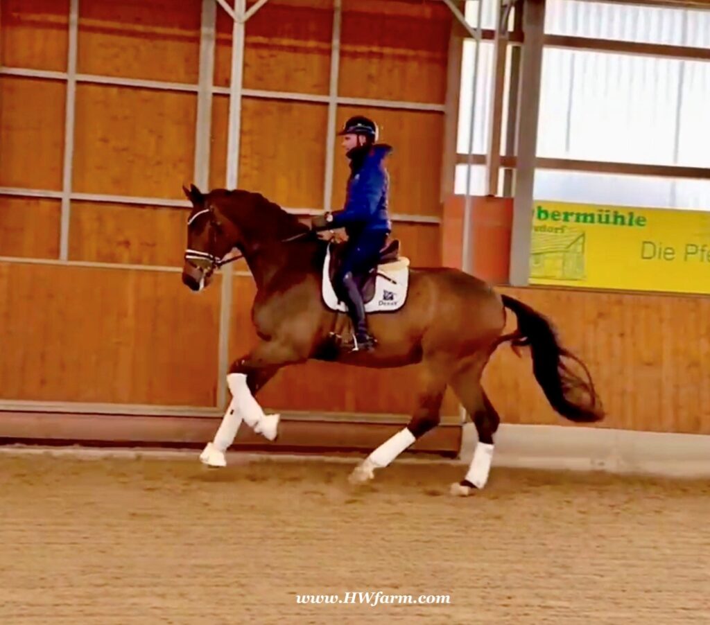 Secret Spice HW, a brave gentleman with a golden heart, check out that freedom in the shoulder and active hind leg! He has a superb rhythm and swings softly through his back, he is very easy to sit. His gaits are just breathtaking, he barely touches the ground. The canter comes with a phenomenal uphill movement with lots of air time, jumping well up, out and under every single time. He is so much fun to watch and ride. The trot is supple and as elastic as it gets, his front legs reach far out and up, totally amazing. His active hind end enables him to look effortless and his hind legs are reaching far under his body. He will be a piaffe and passage machine, that’s very obvious already. A modern dressage horse as it should be.