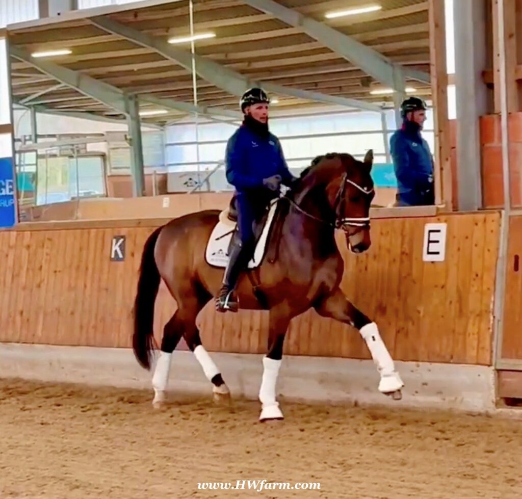 Already successfully shown, Secret Spice HW loves collected work, he goes easily through the neck, on the bit, featherlight for the riders hand. He is just stunning and a horse of a lifetime. His lateral work is a blast, half steps seem easy, flying changes on top, wow – what a horse! A definite GP candidate!