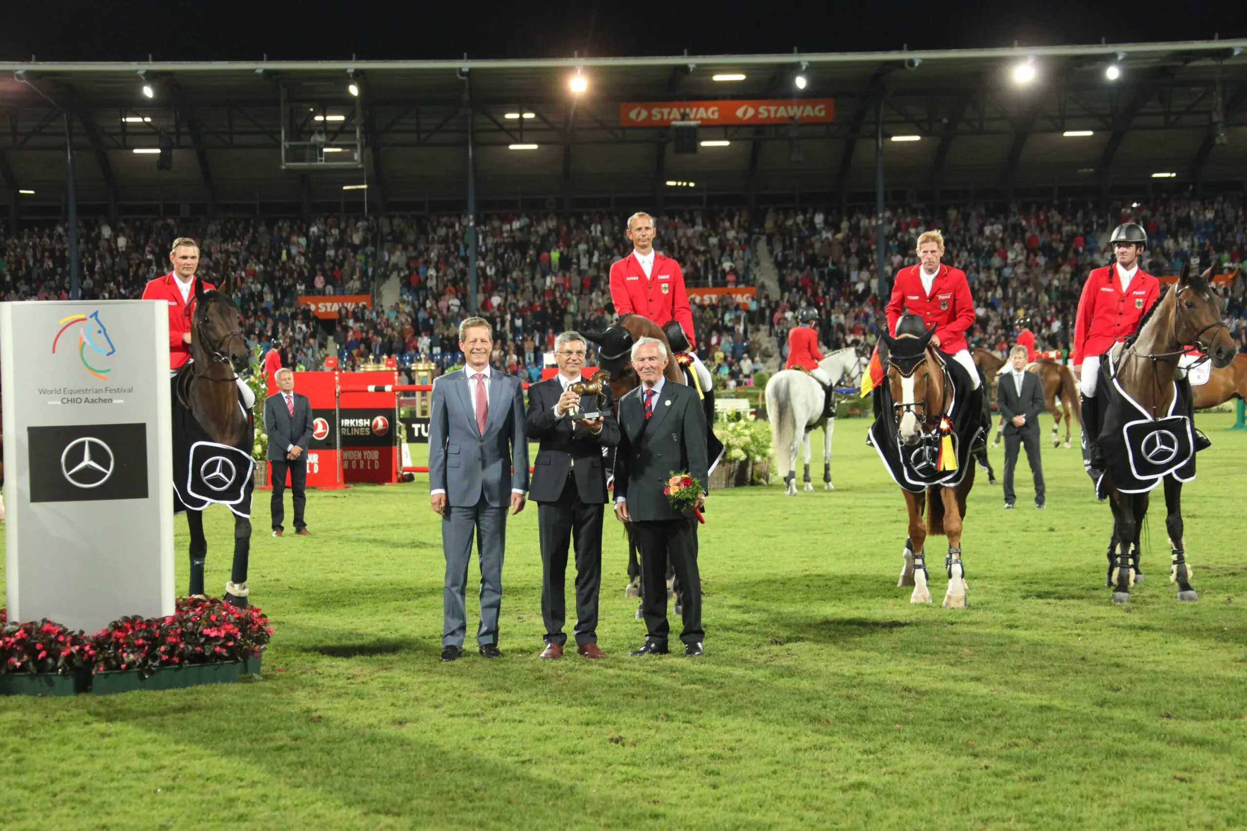 Isabell Werth congratulated by Siegward und Andrea Tesch with Stefanie Peters (Photo: CHIO Aachen). [...]