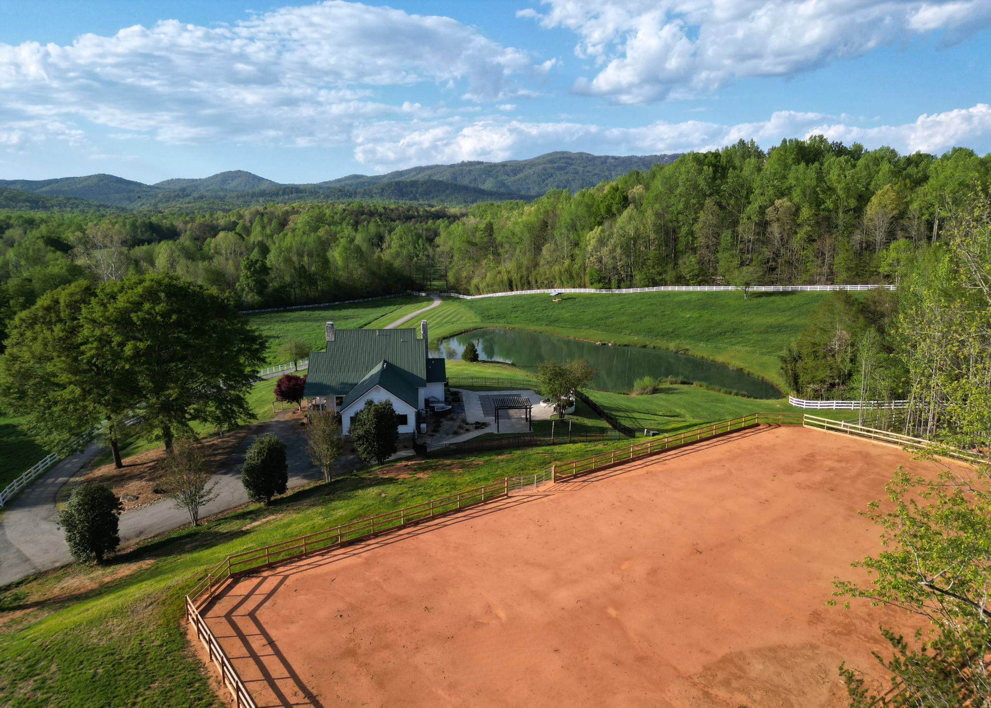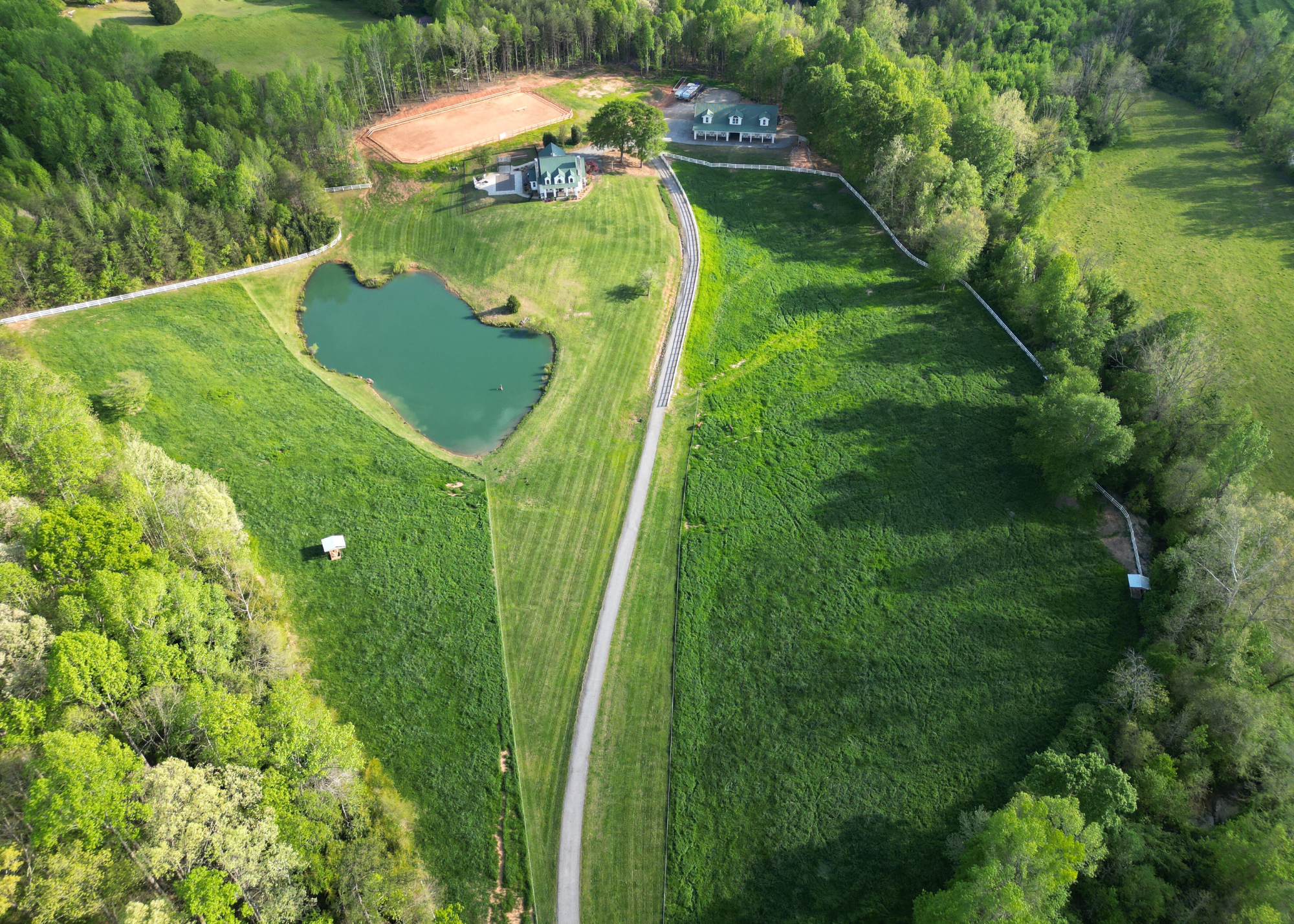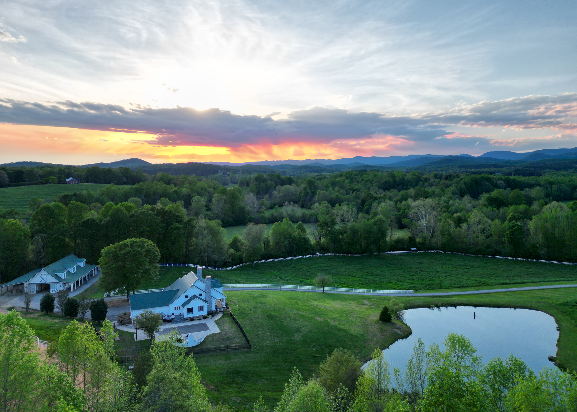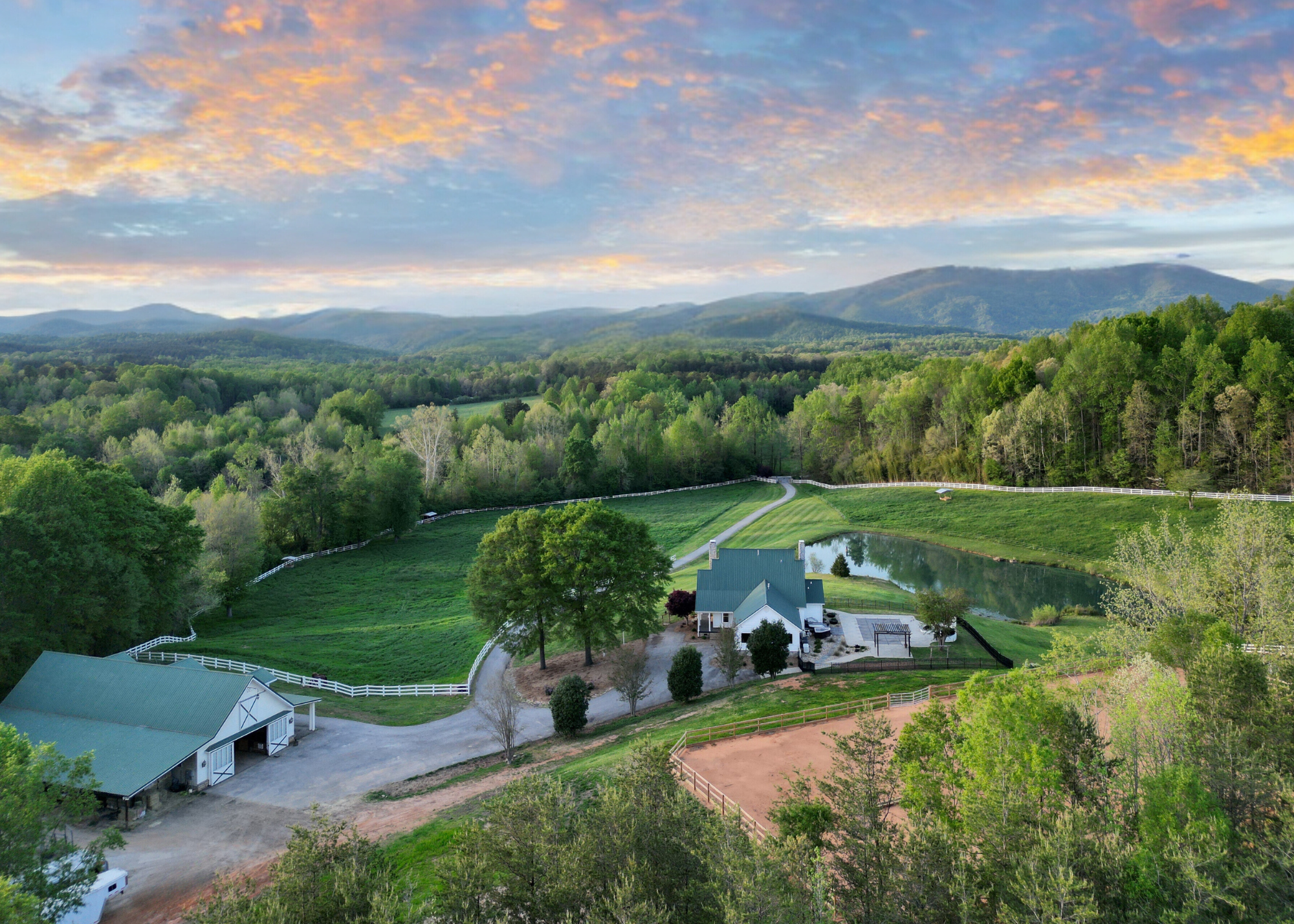 Situated amidst meticulously maintained grass pastures and overlooking a fully stocked spring-fed pond, this custom-built two-story farmhouse spans over 3700 square feet and is complemented by a matching 5000 square foot center aisle barn.