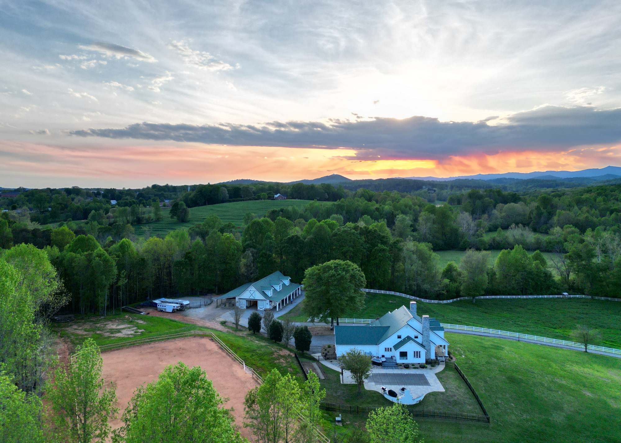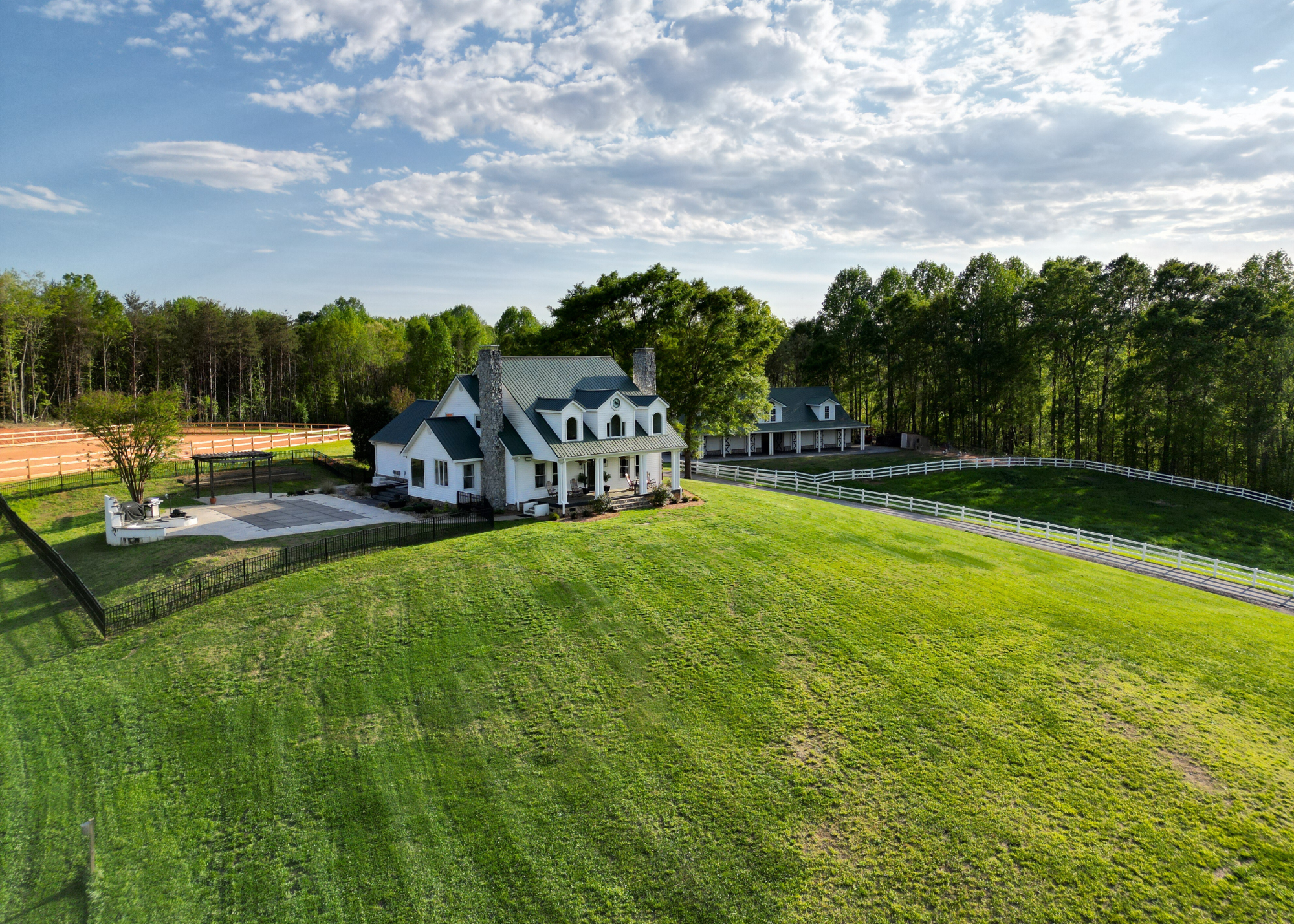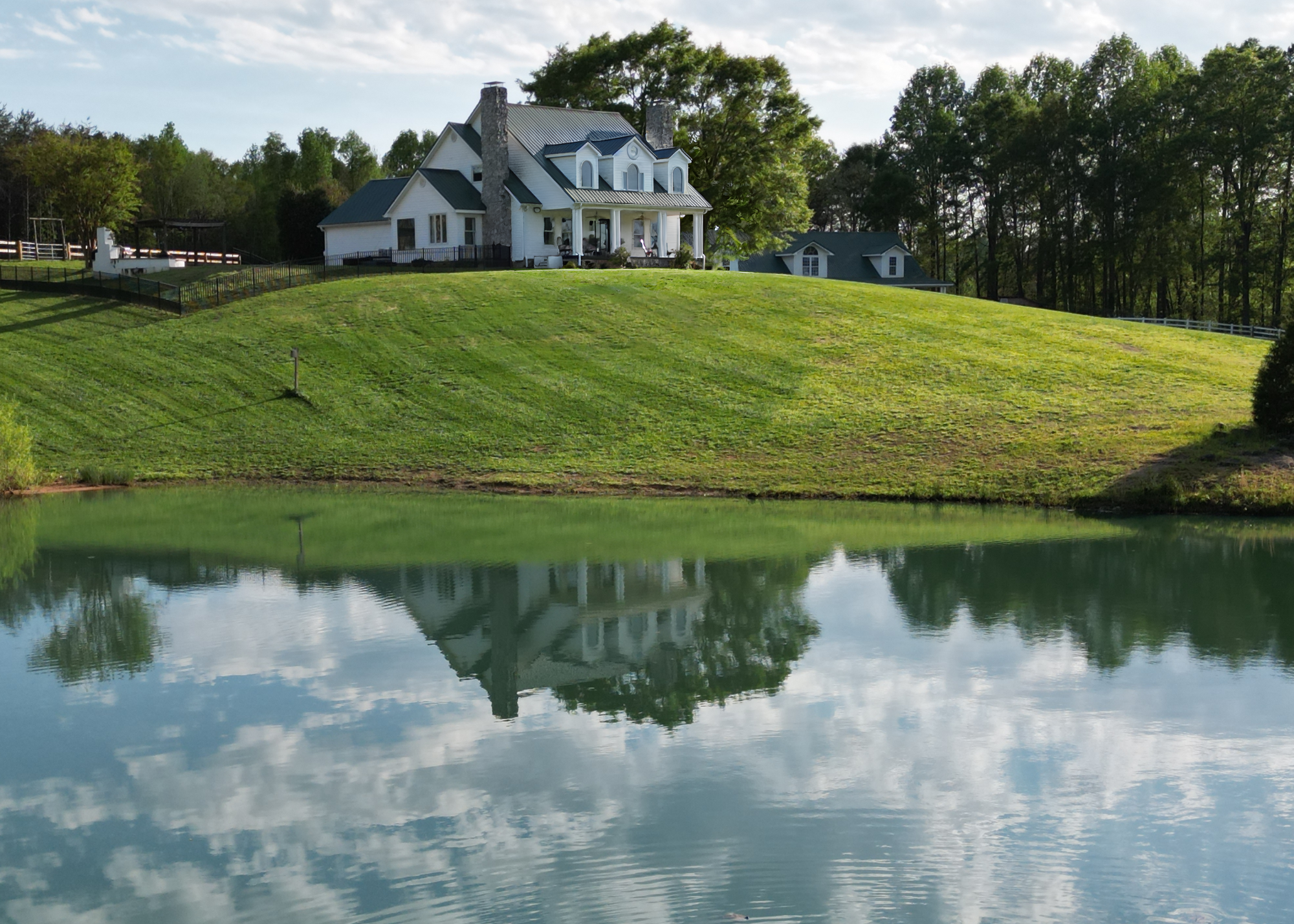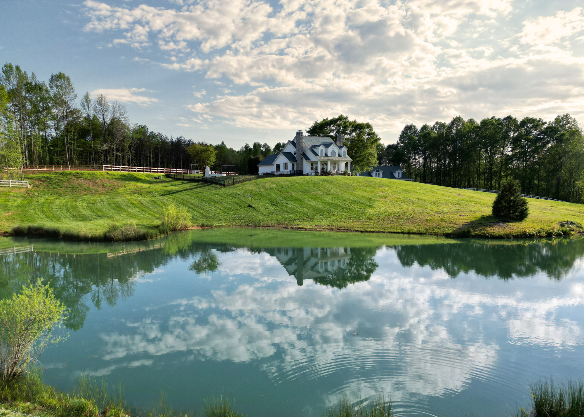 Situated amidst meticulously maintained grass pastures and overlooking a fully stocked spring-fed pond, this custom-built two-story farmhouse spans over 3700 square feet and is complemented by a matching 5000 square foot center aisle barn.