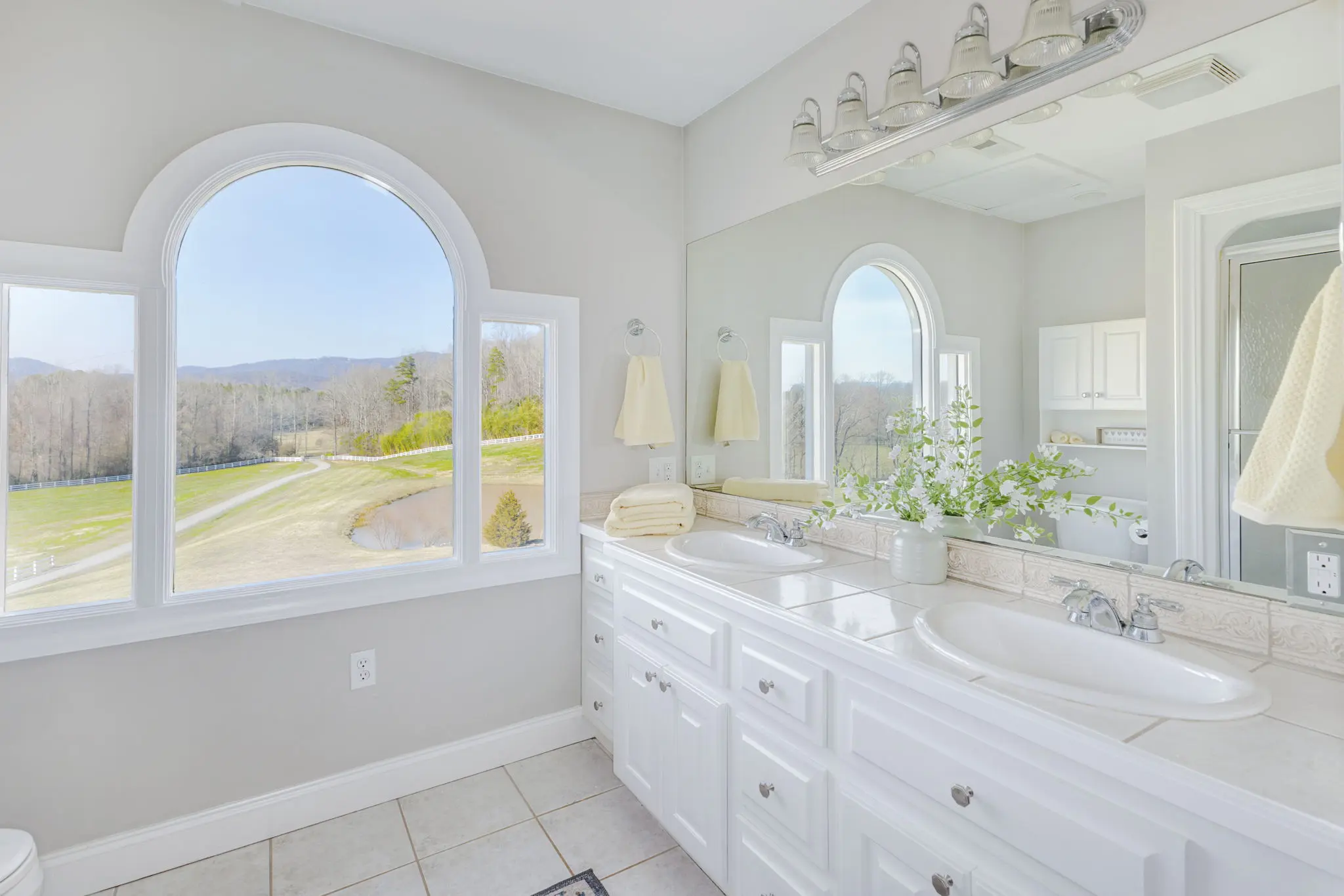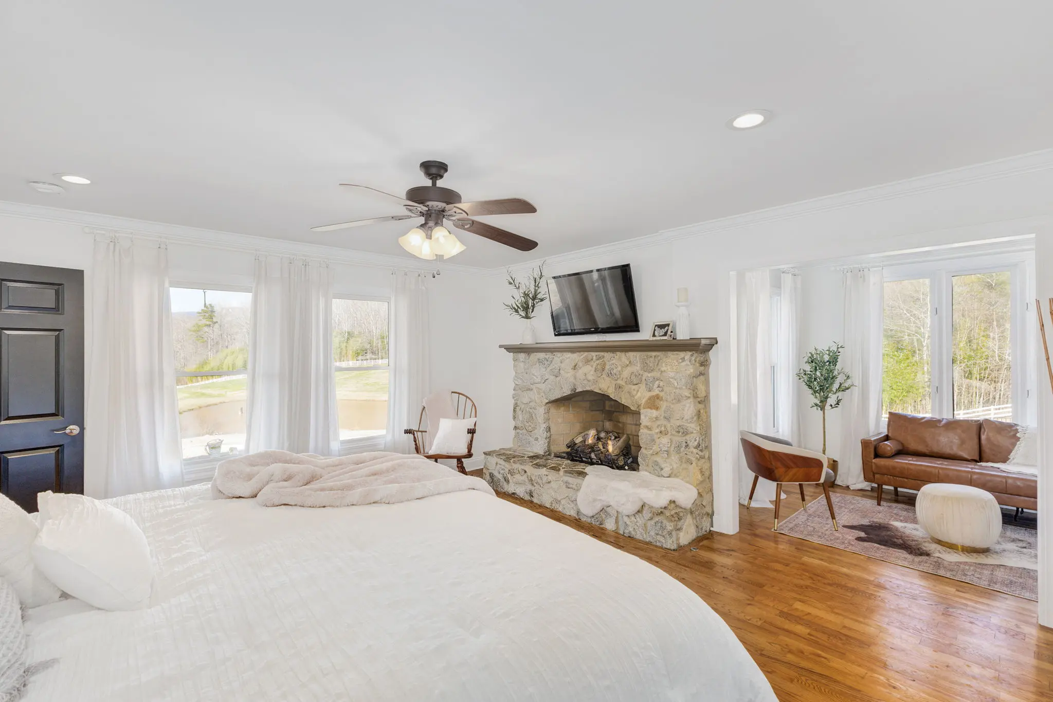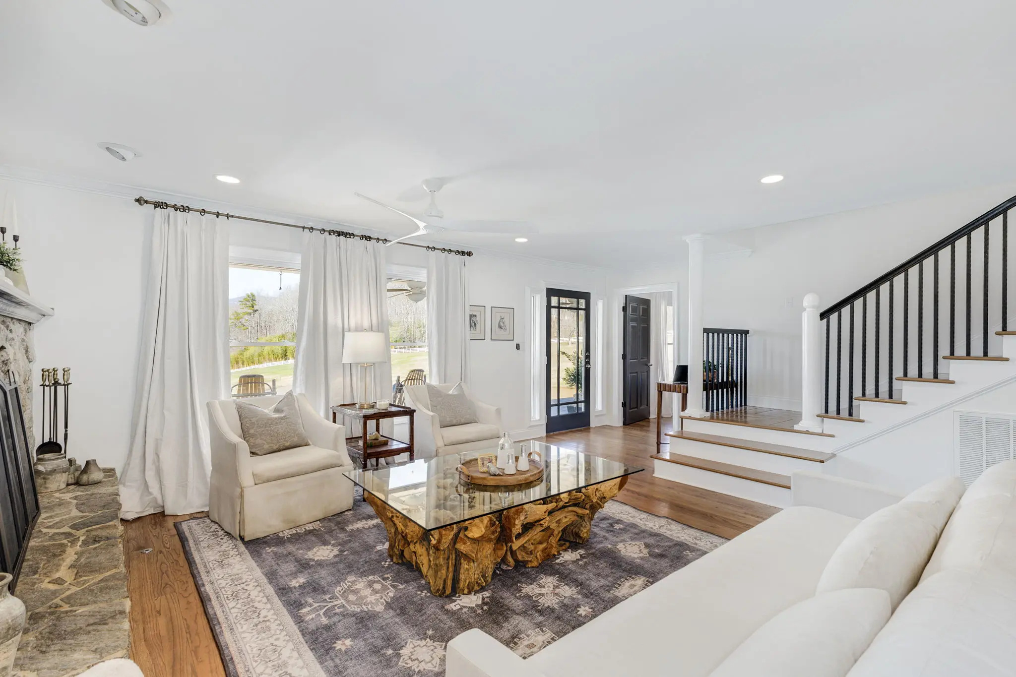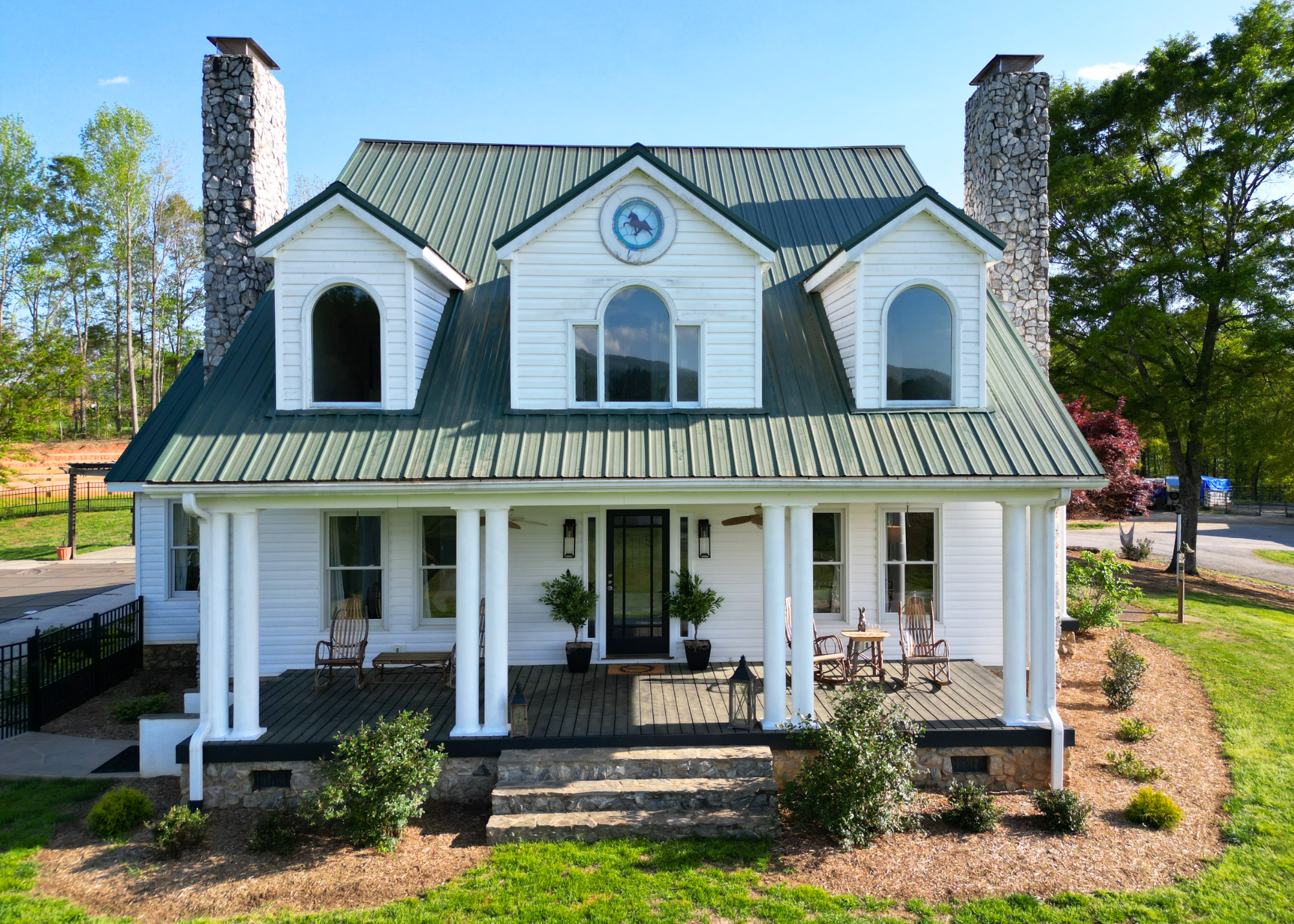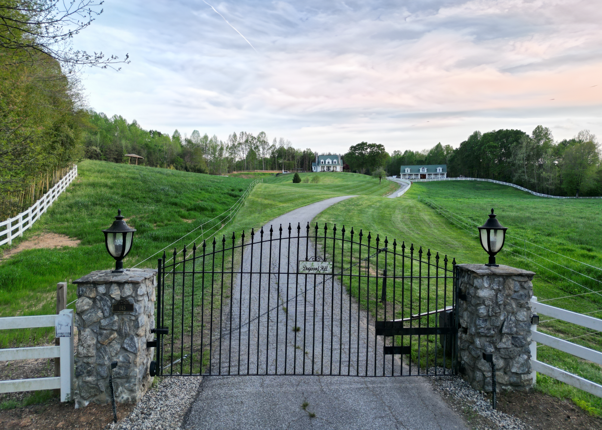 Situated amidst meticulously maintained grass pastures and overlooking a fully stocked spring-fed pond, this custom-built two-story farmhouse spans over 3700 square feet and is complemented by a matching 5000 square foot center aisle barn.